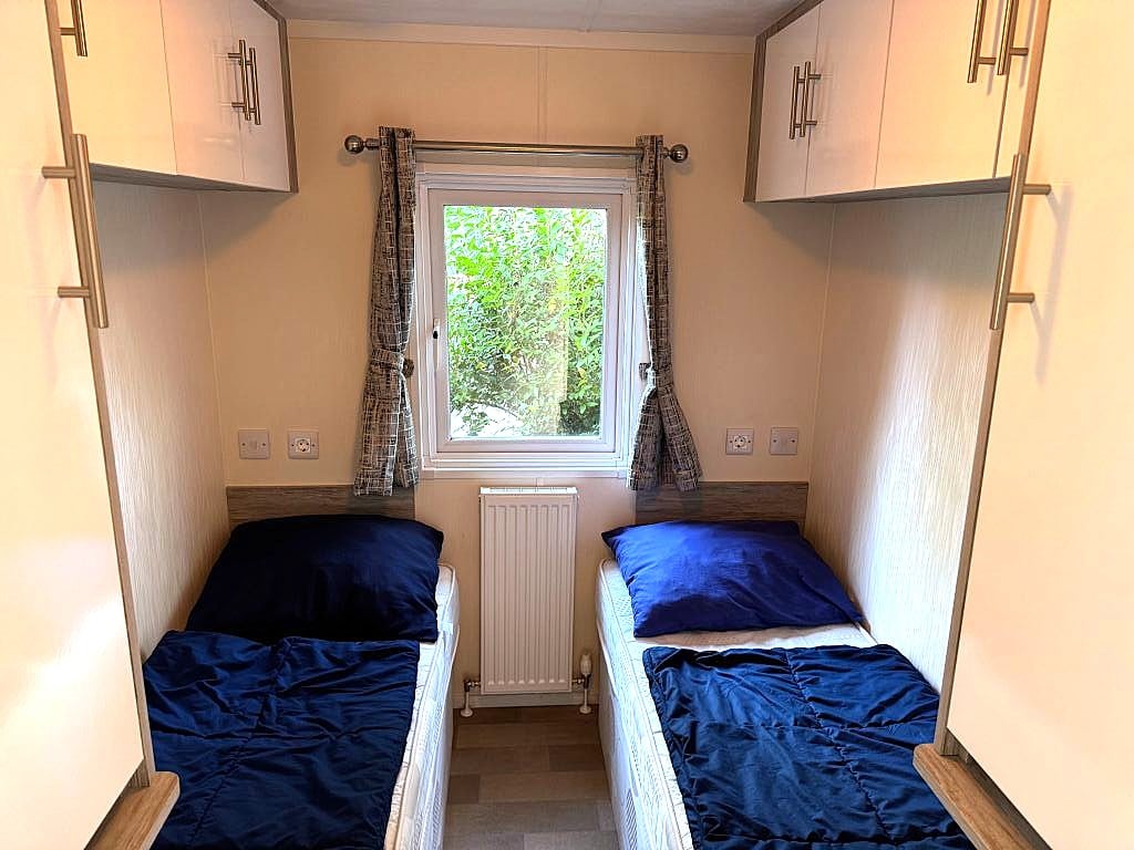 Das erste Schlafzimmer ist mit einem bequemen Boxspring-Doppelbett, einem Einbauschrank mit Schiebetüren, Nachttischen, einem Heizkörper und einem Drehkippfenster ausgestattet. Das zweite Schlafzimmer hat zwei bequeme Einzel-Boxspringbetten, praktische Wandschränke, einen Heizkörper und ebenfalls ein Drehkippfenster.