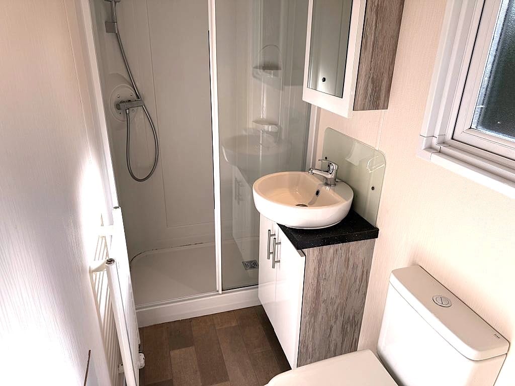 Das Badezimmer ist komplett ausgestattet mit einem Waschbecken mit Schrank und Spiegel, einer Toilette, einer Duschkabine, einem Designheizkörper, einem Drehkippfenster und einer mechanischen Lüftung.