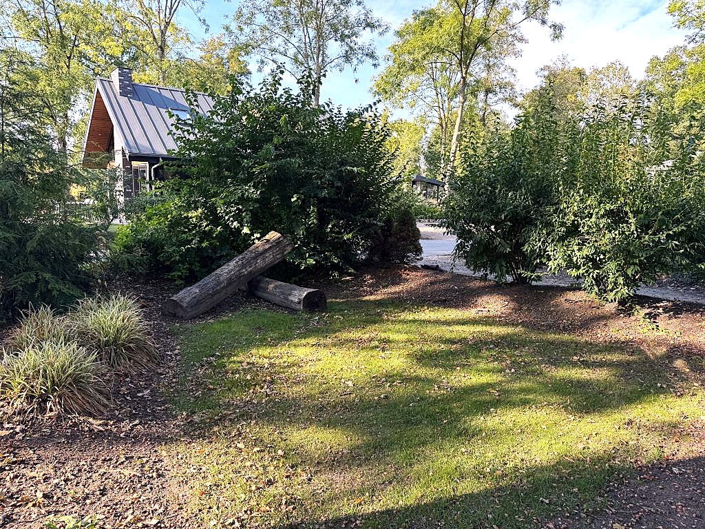 Der Garten fügt sich nahtlos in seine natürliche Umgebung ein und bildet eine harmonische Einheit mit der umgebenden Landschaft. Die Terrasse und die weitläufige Rasenfläche unterstreichen die grüne, erholsame Atmosphäre dieser Oase der Entspannung. Hier finden Sie völlige Entspannung abseits der Hektik des Alltags. Der Garten ist von einer Bepflanzung umgeben, die viel Privatsphäre und einen angenehmen Waldcharakter bietet. Ein privater Parkplatz an der Vorderseite des Grundstücks sorgt für zusätzlichen Komfort und Bequemlichkeit.