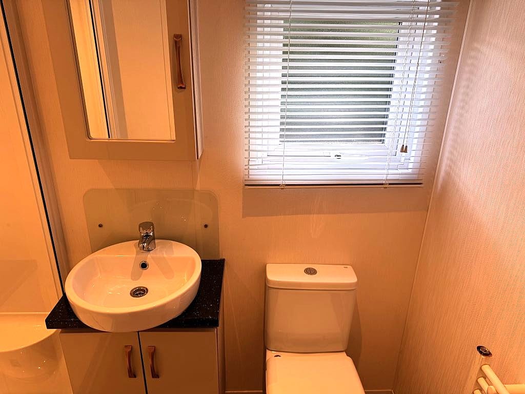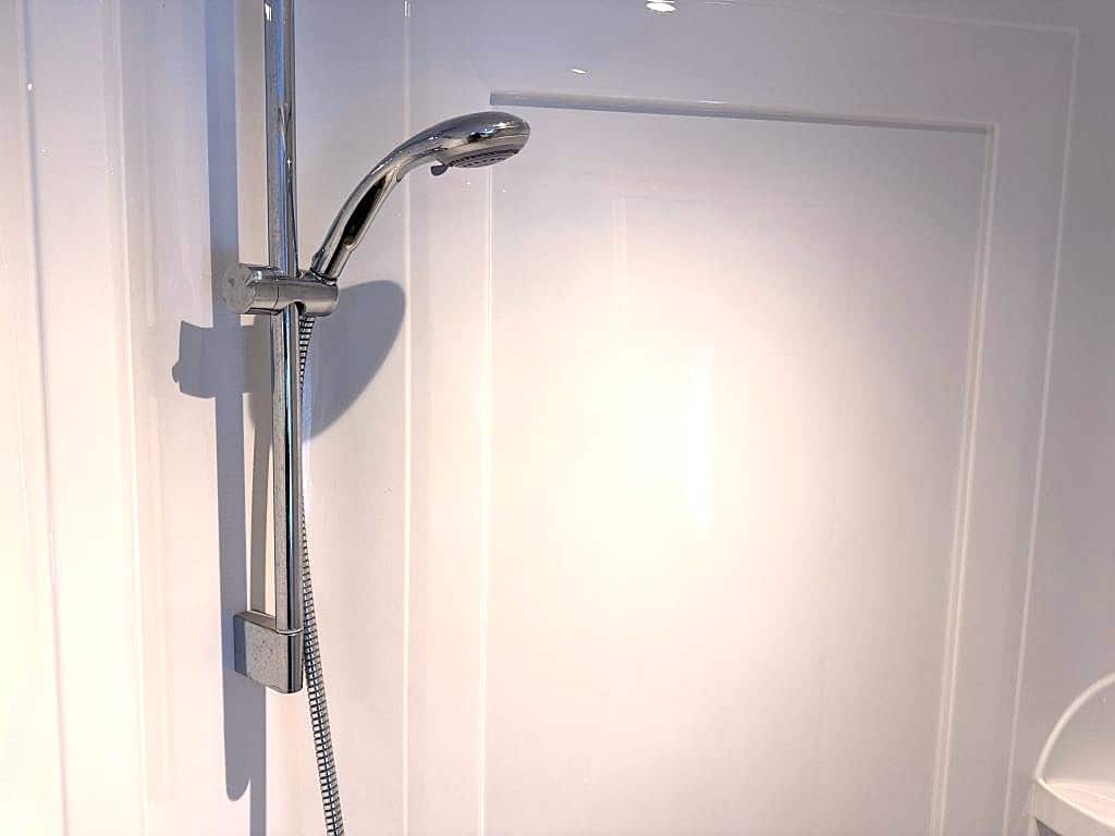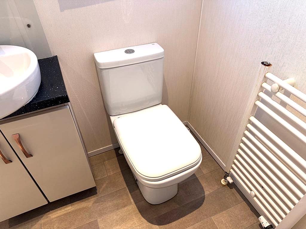 Das Bad ist komplett ausgestattet mit einem Waschbecken mit Schrank und Spiegel, einer Toilette, einer Duschkabine, einem Designheizkörper, einem Drehkippfenster mit Lamellen und einer mechanischen Lüftung.
