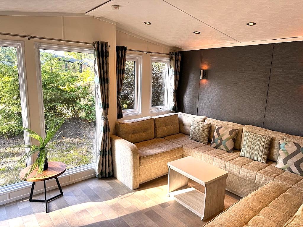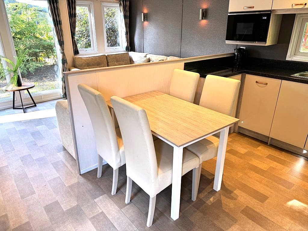 Das Ferienhaus verfügt über ein geräumiges Wohnzimmer mit einem offenen Wohn- und Essbereich. Dank der großen Fenster und der hohen Decke ist der Raum besonders hell und geräumig und bietet eine schöne Aussicht auf den umliegenden Garten. Über den Eingang gelangen Sie auf die Terrasse, wo Sie in aller Ruhe die Sonne genießen können - umgeben von Grün und Privatsphäre.