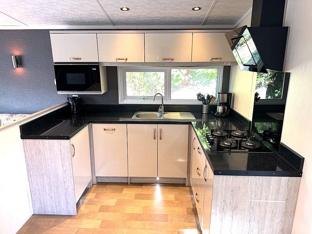 Die in hellen, stilvollen Farben gehaltene Küche ist voll ausgestattet und verfügt über alle Funktionen. Unter anderem finden Sie einen Geschirrspüler, einen Gasherd, eine Dunstabzugshaube, eine Kombimikrowelle, einen Kühlschrank mit Gefrierfach, eine Spüle mit Wasserhahn, einen Wasserkocher, eine Kaffeemaschine und viel Stauraum. Diese Küche ist das kulinarische Herzstück des Ferienhauses und bietet alles, was Sie für einen komfortablen und unbeschwerten Aufenthalt benötigen.