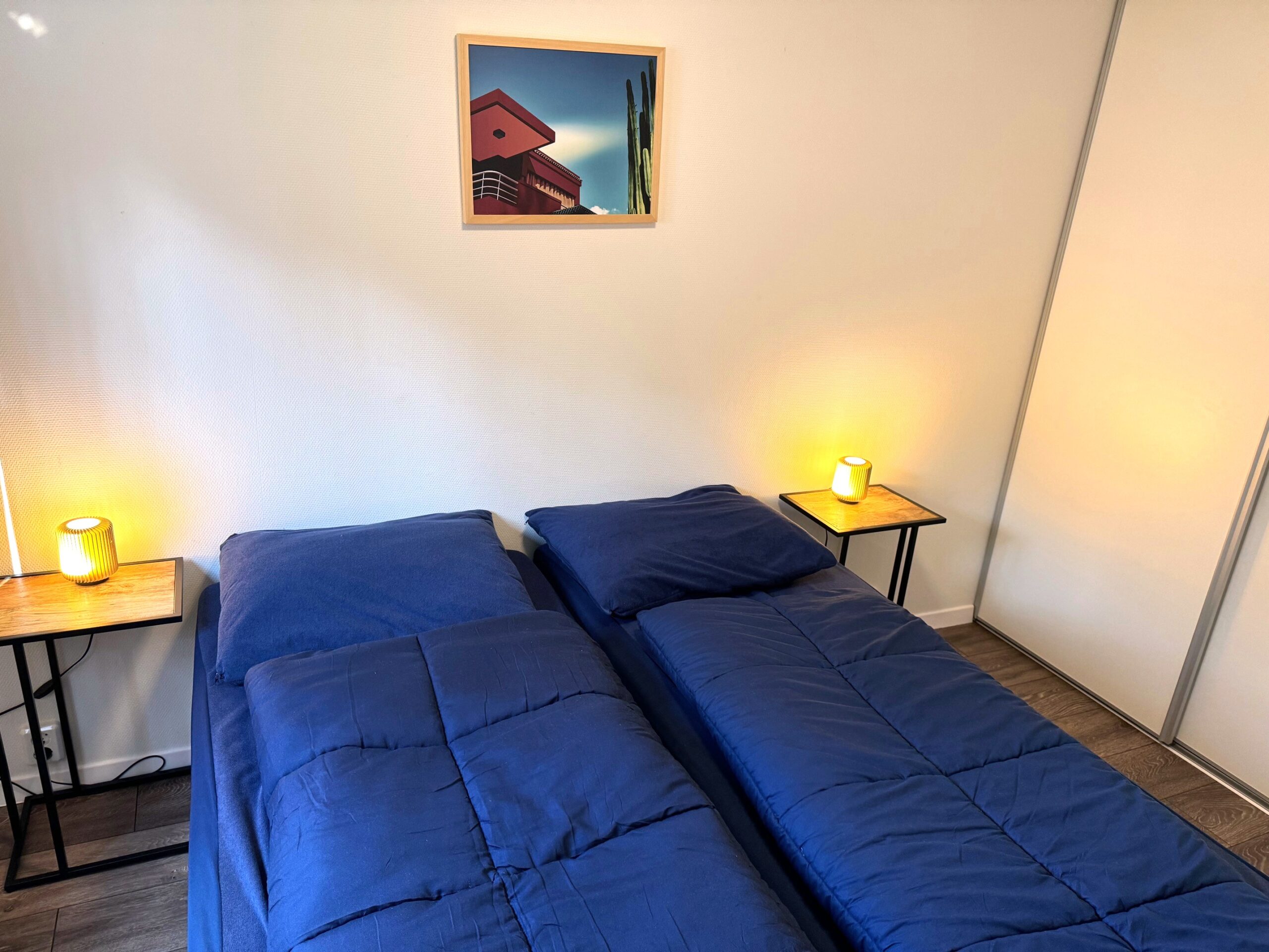 Das Ferienhaus verfügt über 2 geräumige Schlafzimmer, eines davon mit einem Doppelbett (Boxspring), Einbauschrank mit Schiebetüren, Heizkörper, Nachttischen und Dreh-Kipp-Fensterrahmen mit Lüftungsgittern. Das zweite Schlafzimmer hat zwei Einzelbetten (Boxspring), Heizkörper, Nachttisch, Wandregal und einen Dreh-Kipp-Fensterrahmen mit Lüftungsgittern.