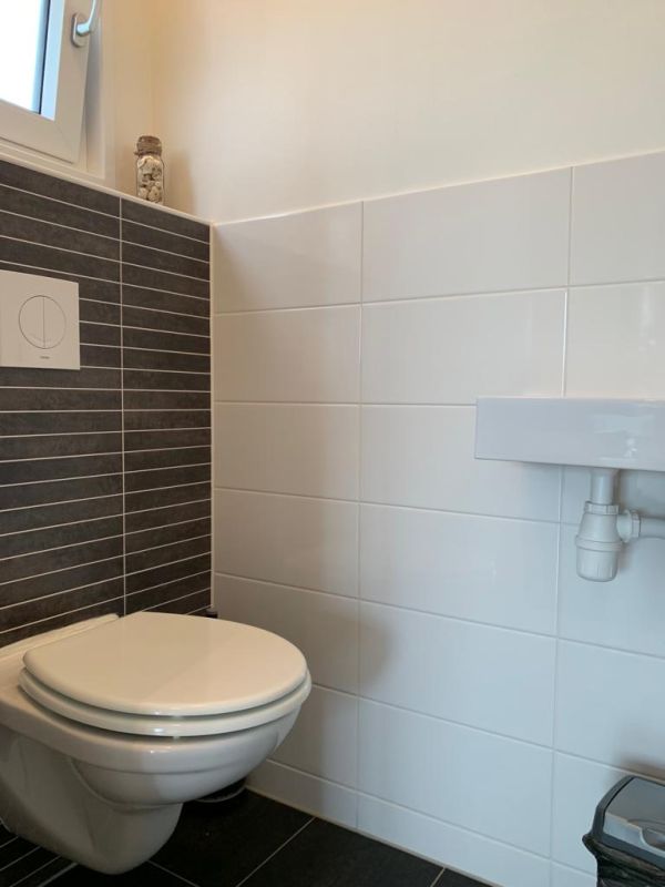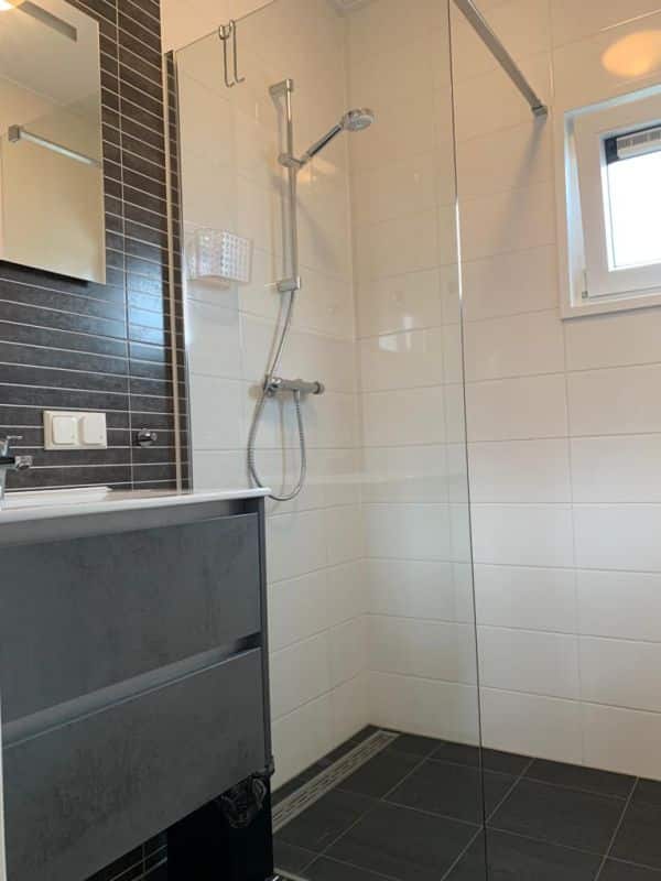 De volledig betegelde en Luxe badkamer is voorzien van een toilet, wastafel met meubel en spiegelkast, inloopdouche, design radiator, kiepraam en een mechanische ventilatie.