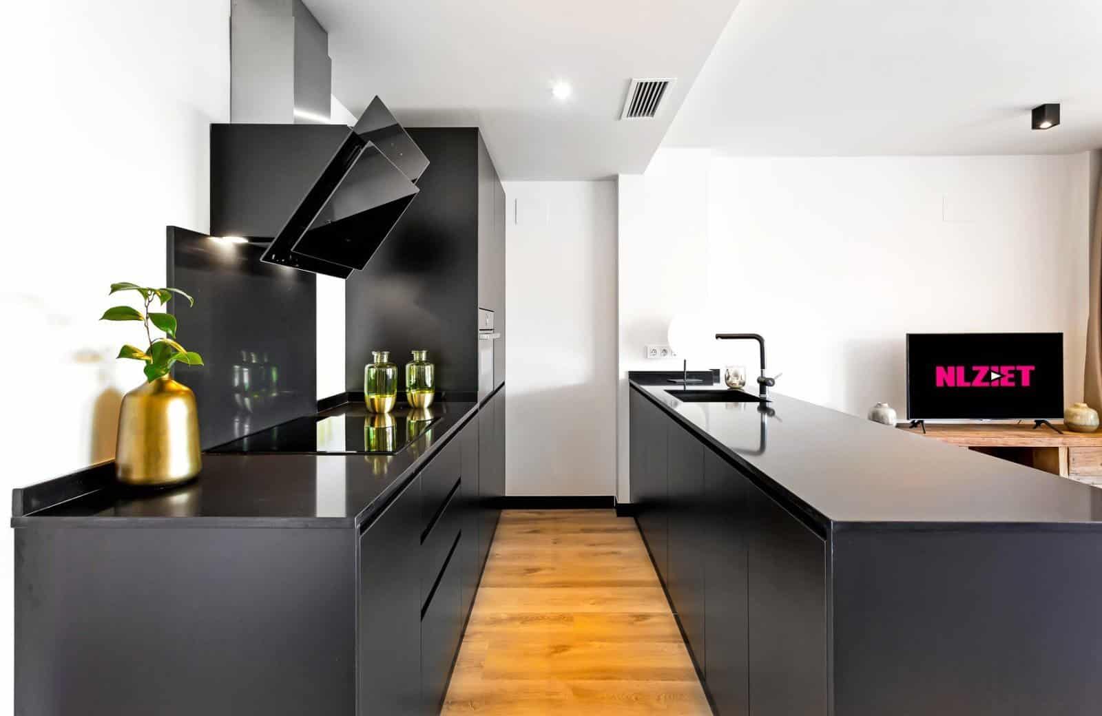 De luxe en moderne keuken is in mat zwart uitgevoerd en van alle moderne gemakken voorzien zoals een vaatwasser, inductiekookplaat, afzuigkap, combi magnetron, koelkast met vriesvak, afwasbak met kraan en veel opberg/kast-ruimte. De keuken vormt het culinaire middelpunt van het vakantiehuis.