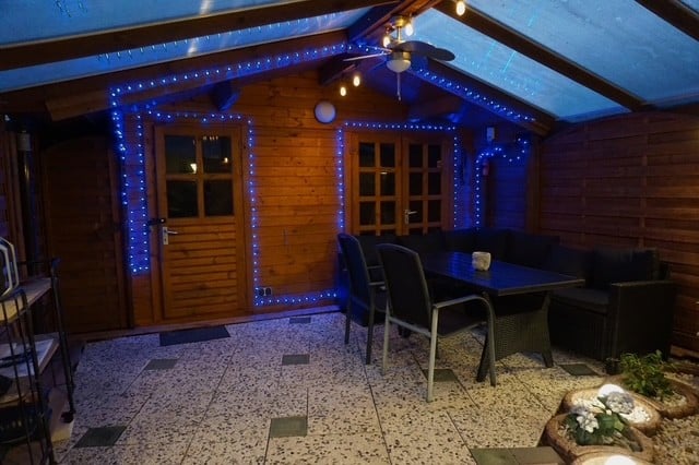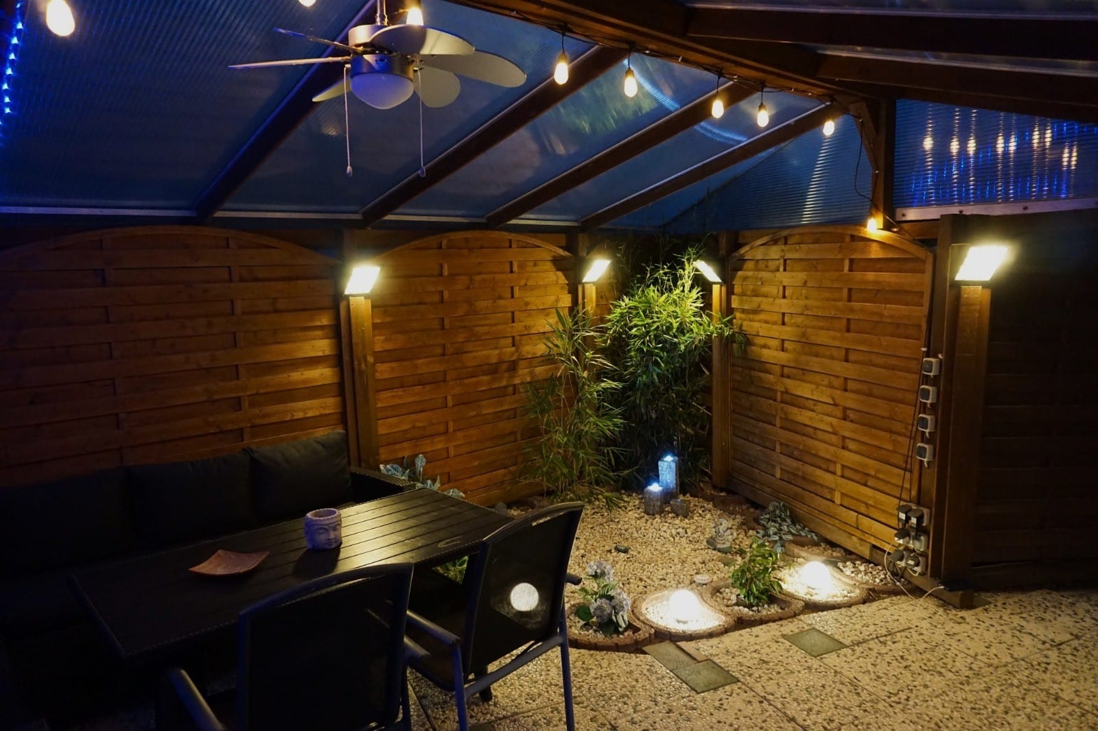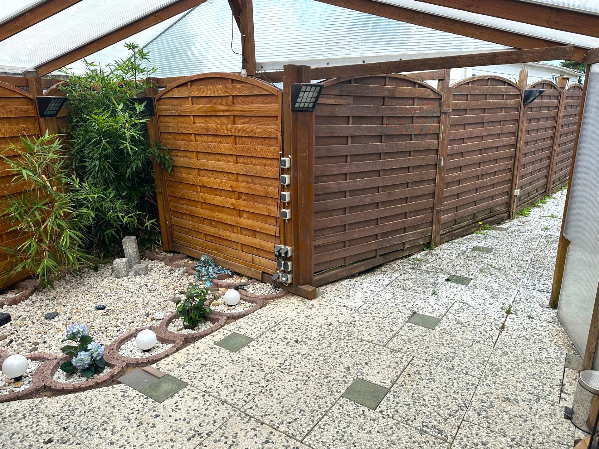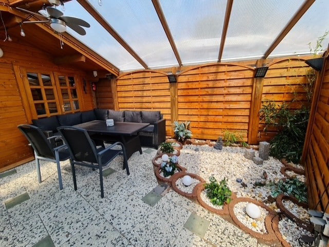 De tuin is makkelijk te onderhouden en vanuit hier kunt u genieten van het mooie vrij uitzicht over het grasveld. Achterin de tuin staat er nog een zeer royale houten tuinhuis van 4 x 5 meter, die nu wordt gebruikt voor de tieners van het gezin zodat die der eigen plekje hebben om lekker samen te genieten. De tuinhuis is ideaal om te gebruiken als Loft met extra verblijf of ideaal als extra woonkamer of tuinkamer. Aan de tuinhuis zit een overkapping vast waar je tijdens de warme zomer dagen uit de zon zit en tijdens de regenachtige winterdagen uit de regen zit. Ideaal om lekker even van elkaar te genieten van rust en privacy of om te genieten van een heerlijke BBQ met vrienden en familie zonder dat andere op je kijken.