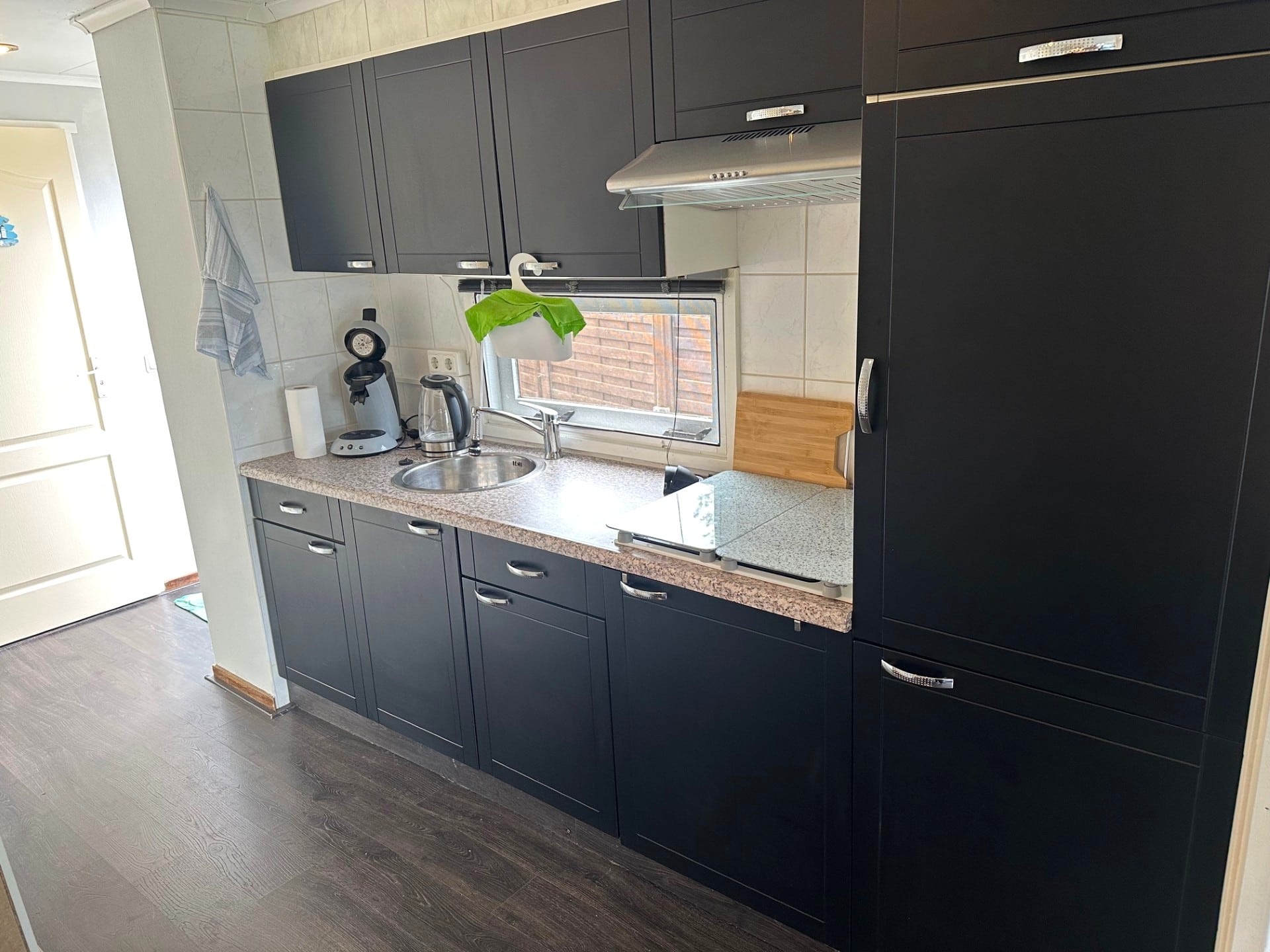 De keuken is in het mat zwart uitgevoerd en voorzien van een 4 pits gaskookplaat met afzuigkap, koelkast, combimagnetron, afwasbak met kraan en veel opberg/kast-ruimte.