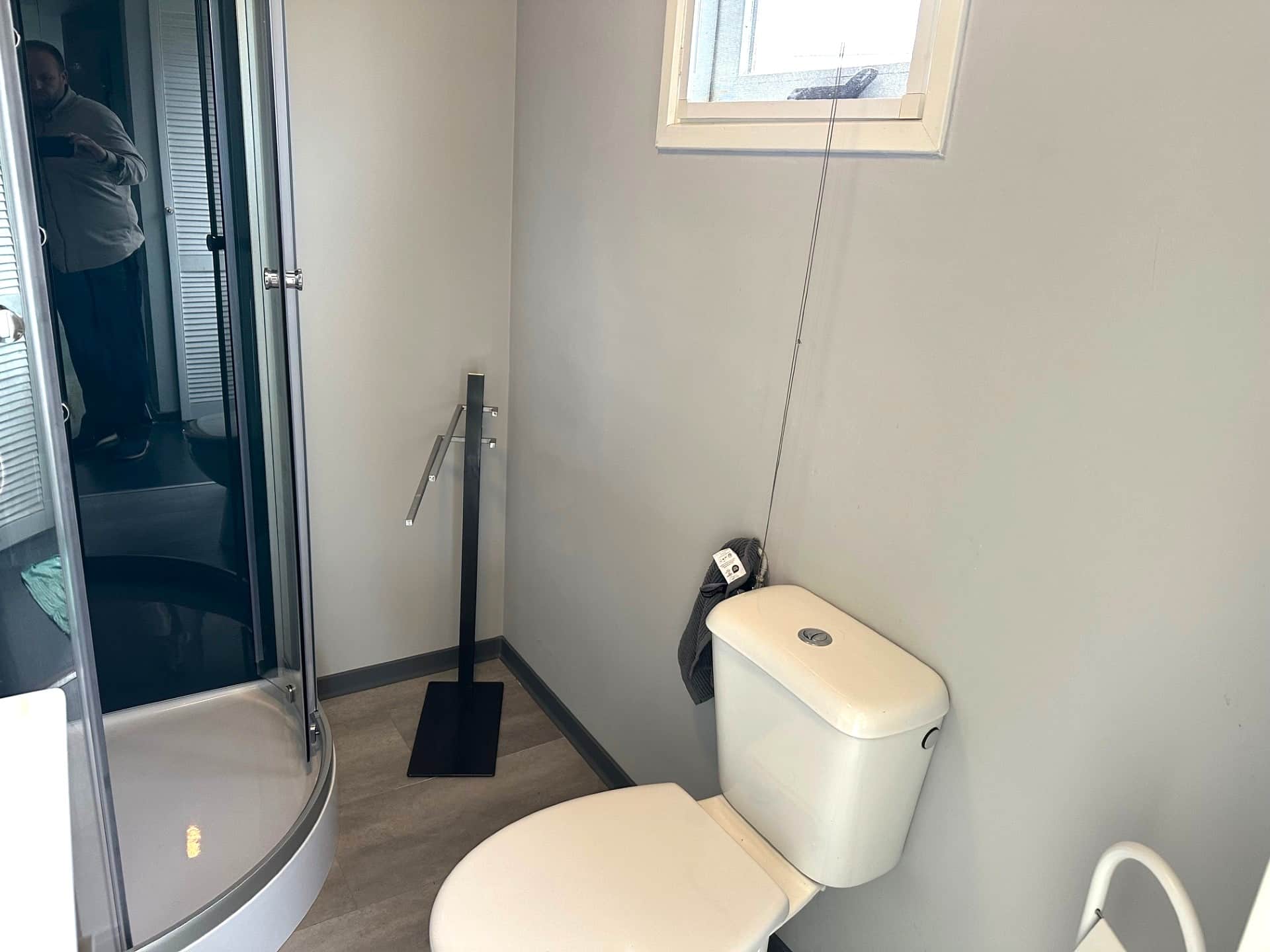 De volledig betegelde badkamer is voorzien van een douche, toilet, wastafel met meubel en spiegel, mechanische ventilatie en een kiepraam.