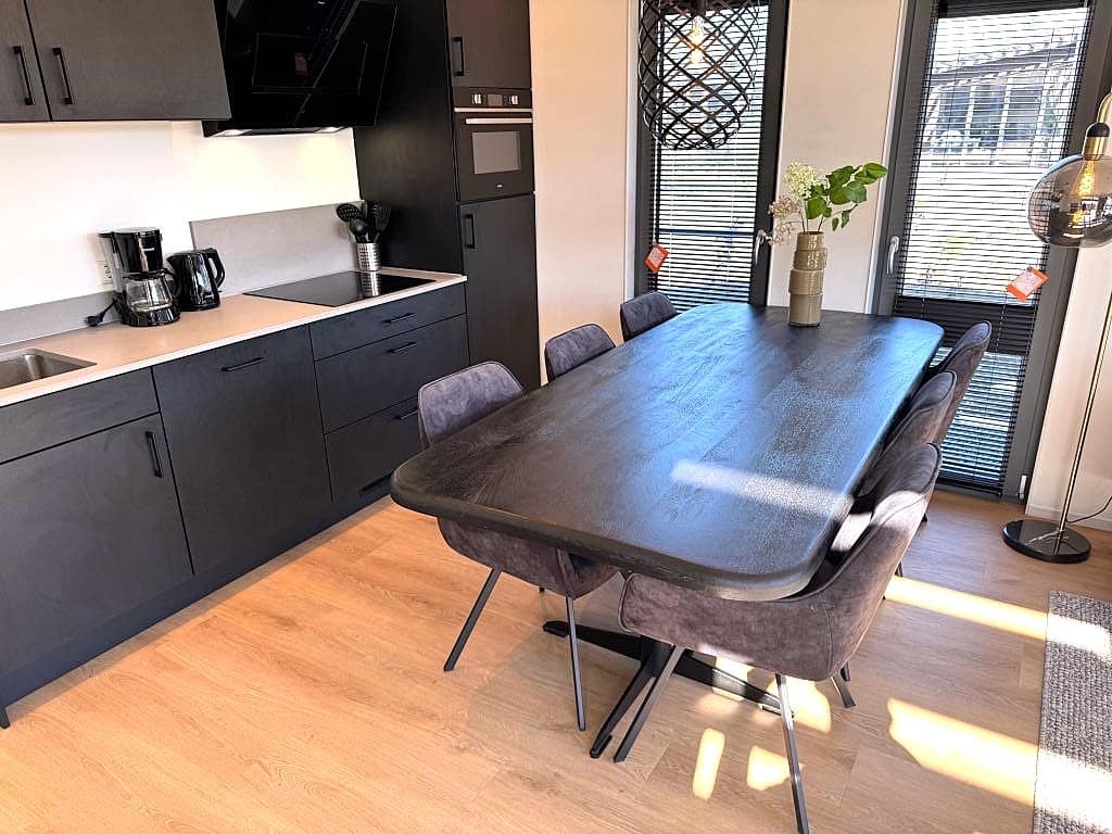 Het vakantiehuis beschikt over een royale woonkamer die hoogwaardig is afgewerkt in rustige kleuren met een open eet en woon gedeelte. Door het gebruik van vele grote raampartijen geniet je van veel ligt inval en creëer je een extra ruimtelijk gevoel. In het vakantiehuis vindt u een moderne, ruime living, ingericht met een stijlvolle design zodat het direct een warme sfeer geeft . Een perfecte plek wanneer u samen wilt genieten van een heerlijke maaltijd, het spelen van een gezelschapsspel of wanneer u simpelweg een film wilt kijken. Doormiddel van openslaande terrasdeuren loopt u zo vanuit de woonkamer het betegeld terras op waar u heerlijk kunt genieten van de ruime tuin. Let op! foto's zijn van een vergelijkbaar model.