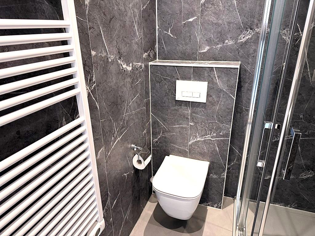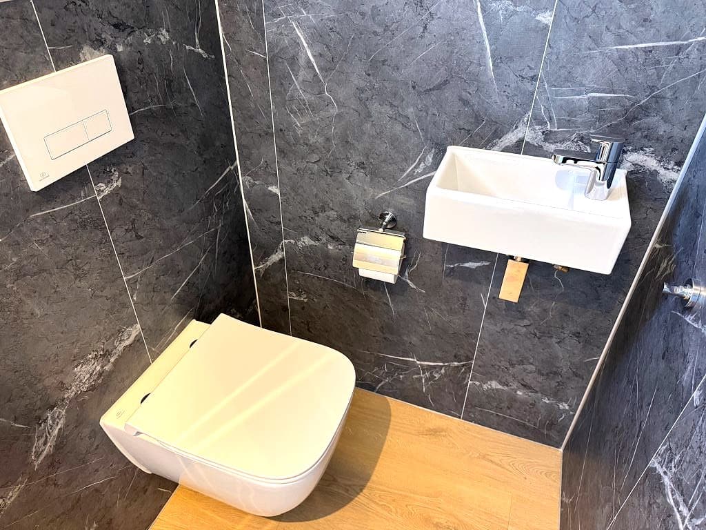 Er zijn maar liefst 2 riante en moderne badkamers die beide zijn voorzien van 100% waterdichte trespa platen in tegel en betonlook, een inloopdouche met regenkop, wastafel met meubel en een spiegel, design radiator, mechanische ventilatie en een kiepraamkozijn. in de hal is er een aparte toilet ruimte.