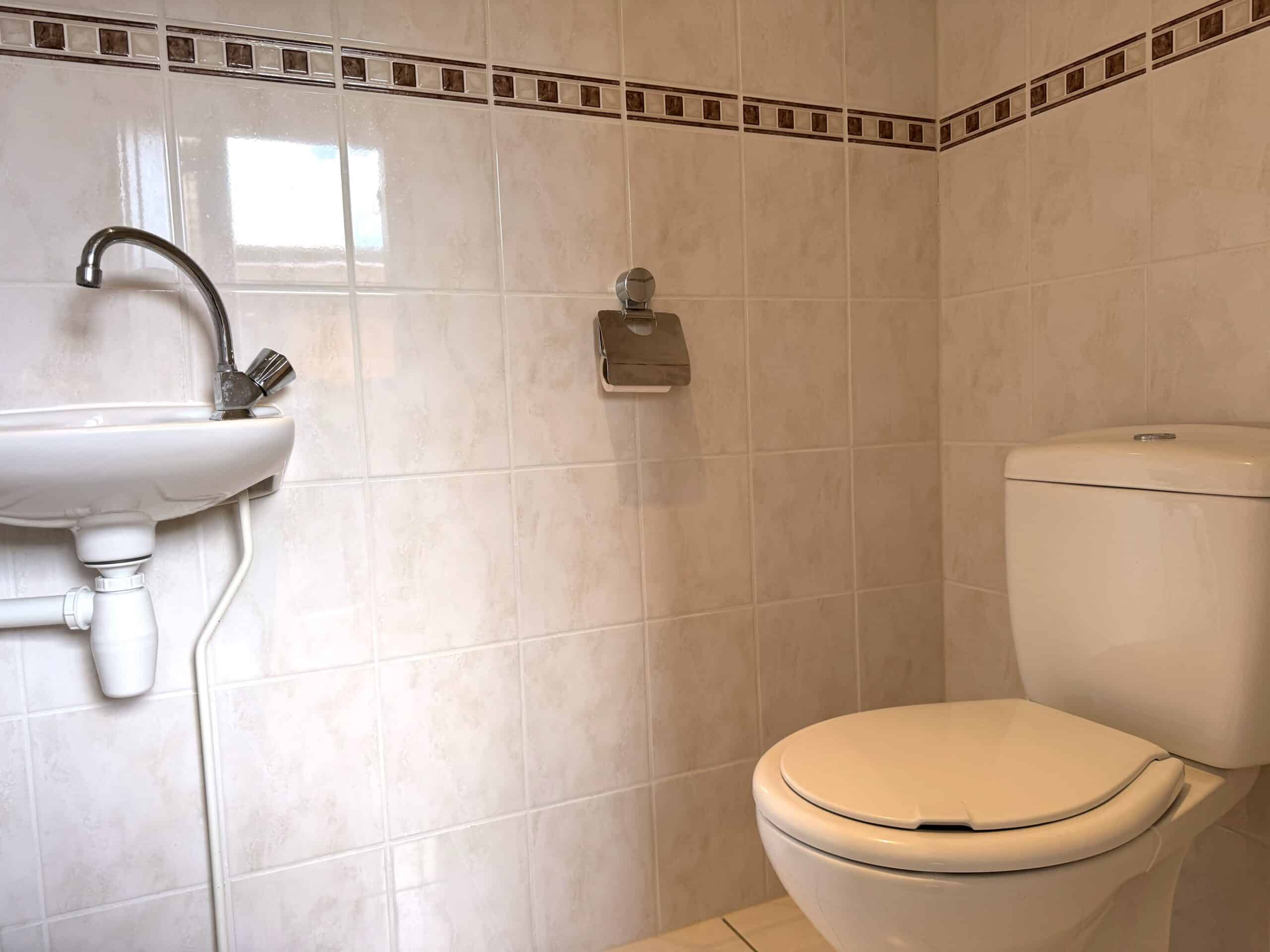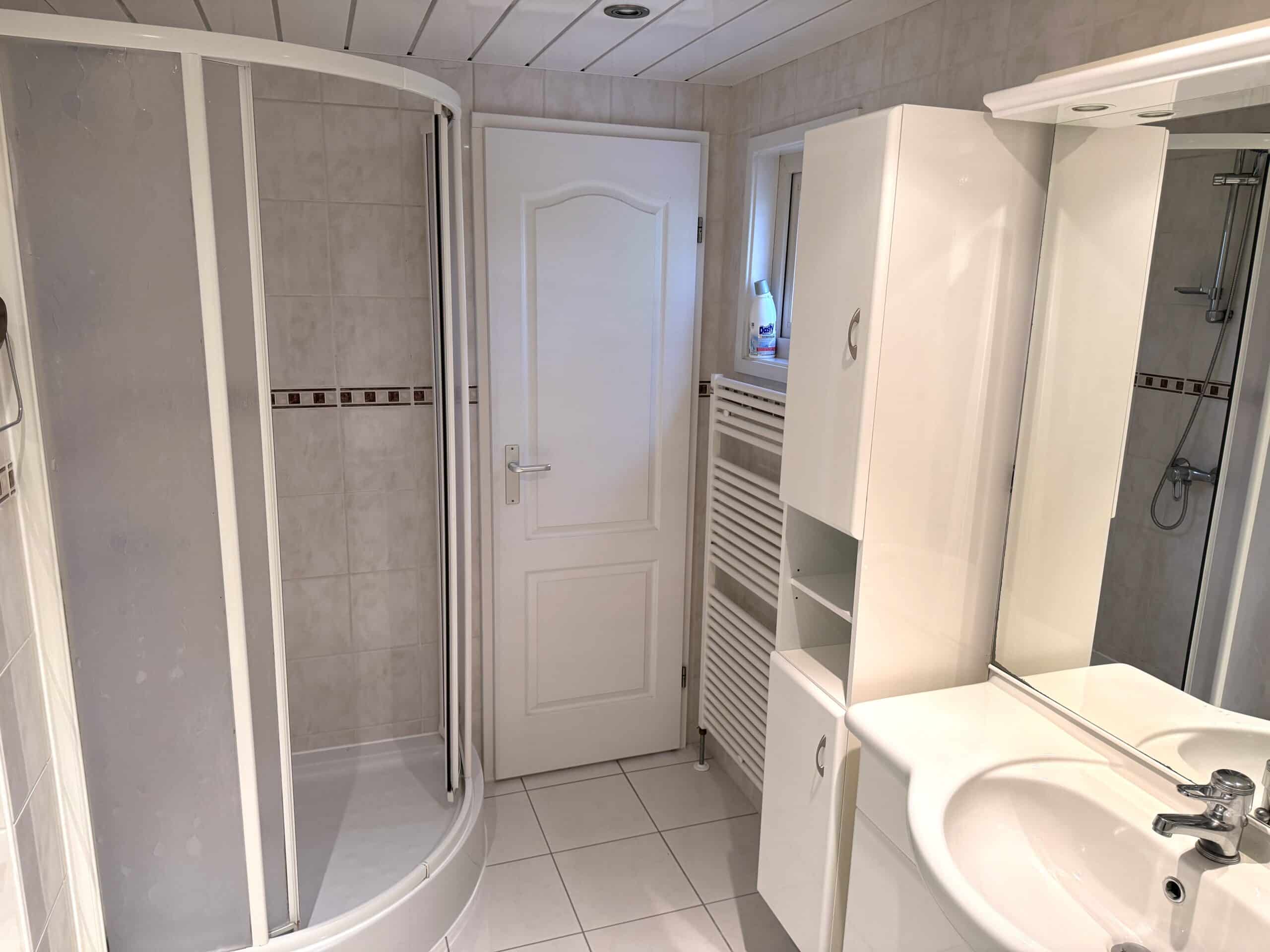 De ruime badkamer is voorzien van een ruime douche cabine, wastafel met meubel en een spiegel, toilet, design radiator en een kiep/kantel raamkozijn. In de badkamer is ook de ingang naar een opberg ruimte met was- en droogmachine aansluiting en ingang naar uw betegeld terras.