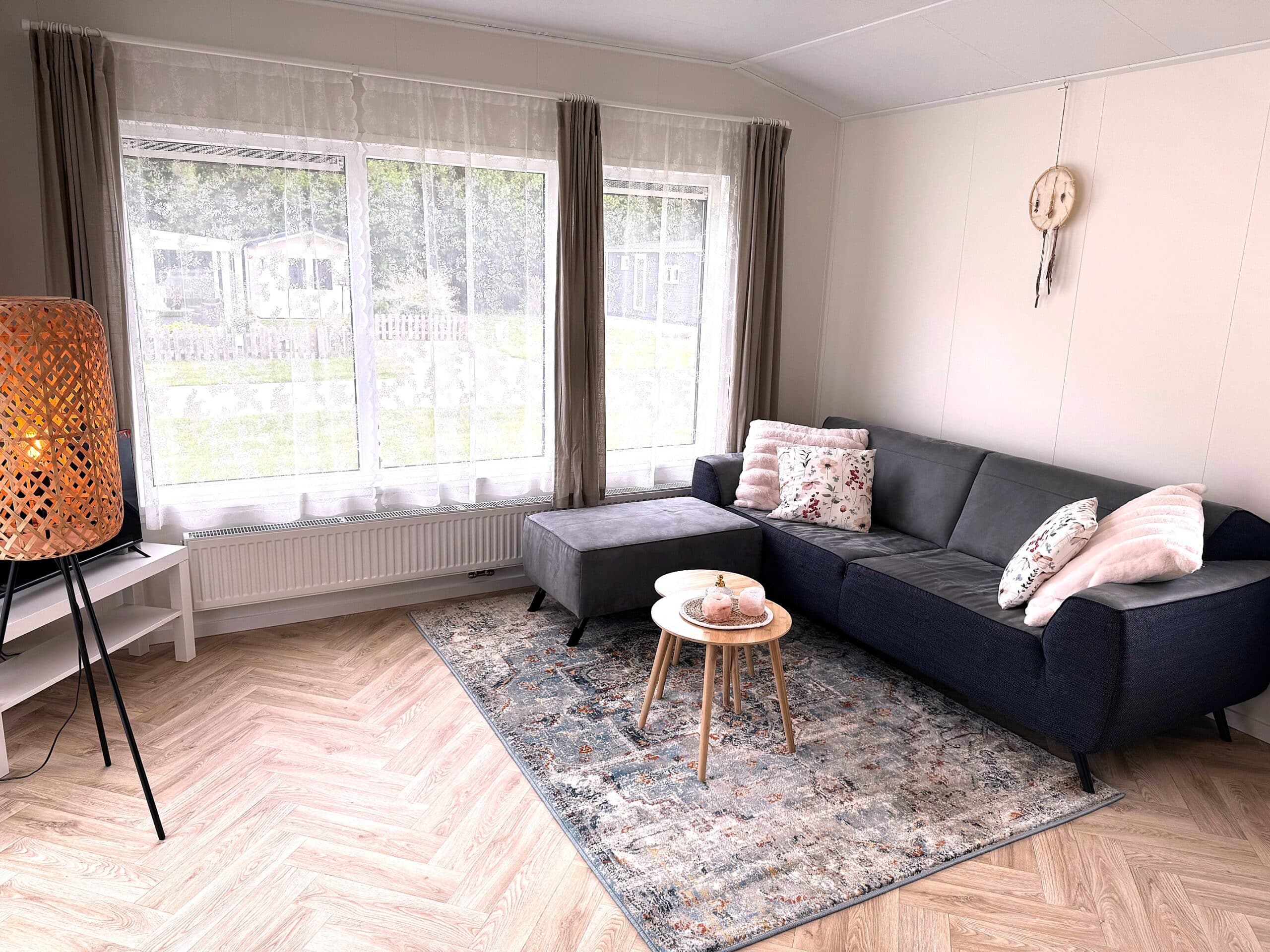 Het vakantiehuis beschikt over een royale woonkamer met een open woon- en eetgedeelte. Dankzij de grote raampartijen en het hoge plafond voelt de ruimte licht en ruim aan, en geniet u van een weids uitzicht op de omliggende tuin. Via de entree stapt u direct het betegelde terras op, waar u in alle rust kunt genieten van de zon, omringd door groen.