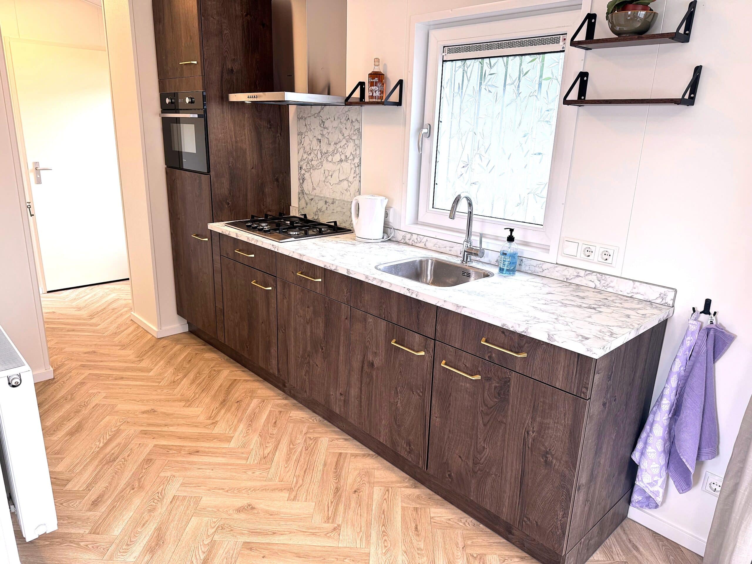 De moderne keuken, uitgevoerd in een stijlvolle donkere houttint, is van alle gemakken voorzien. U vindt er onder andere een vaatwasser, inductiekookplaat, afzuigkap, combimagnetron, koelkast met vriesvak, spoelbak met kraan, waterkoker en ruime opbergmogelijkheden. De keuken vormt het culinaire hart van het vakantiehuis en biedt alles wat u nodig heeft voor een comfortabel en zorgeloos verblijf.