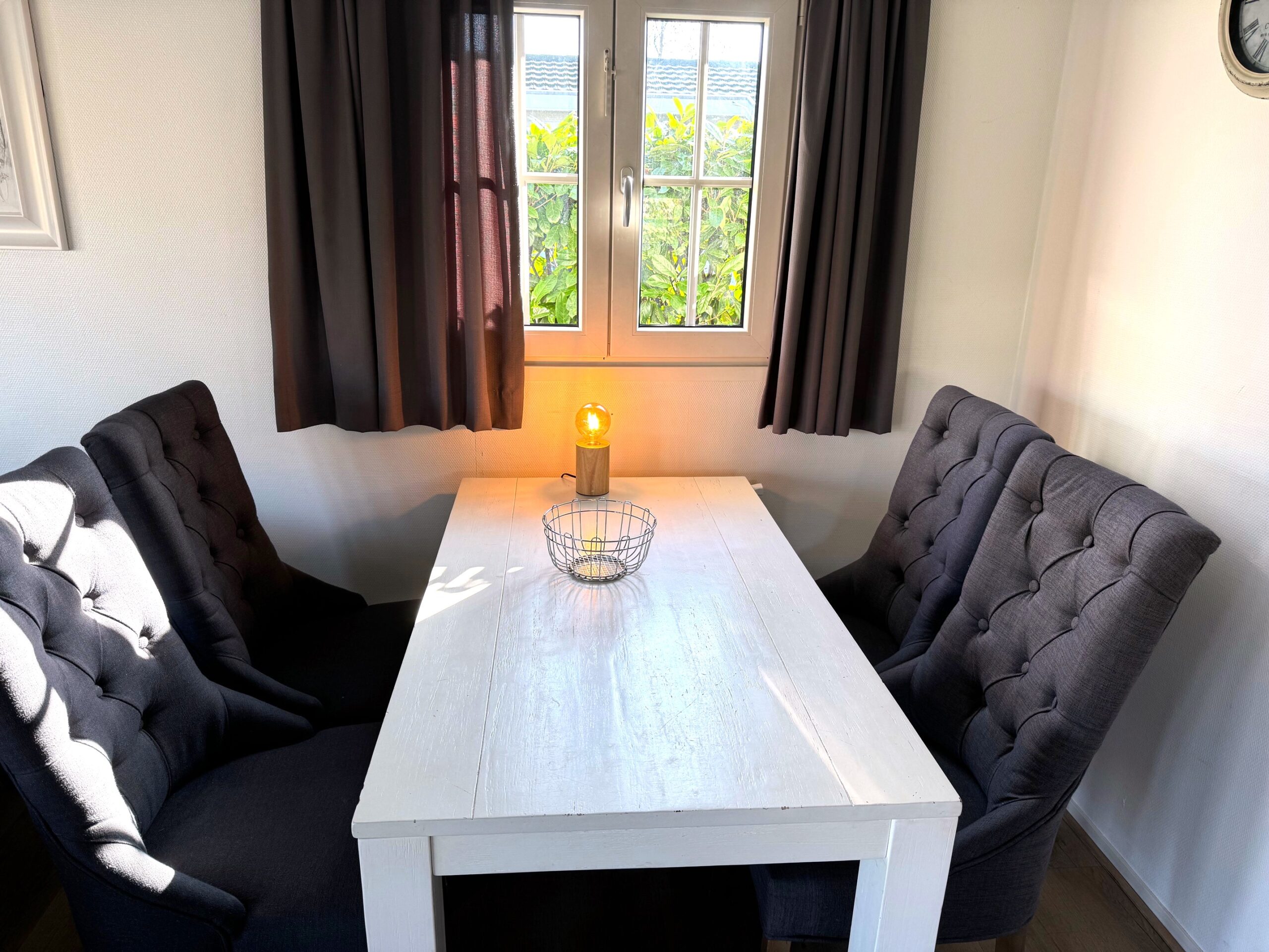 De moderne keuken uitgevoerd in hoogglans wit is van alle moderne gemakken voorzien zoals een vaatwasser, 4 pits gasfornuis, afzuigkap, combimagnetron, koelkast met vriesvak, afwasbak met kraan, waterkoker, koffiezetapparaat en veel opberg/kast-ruimte. De keuken vormt het culinaire middelpunt van het vakantiehuis.