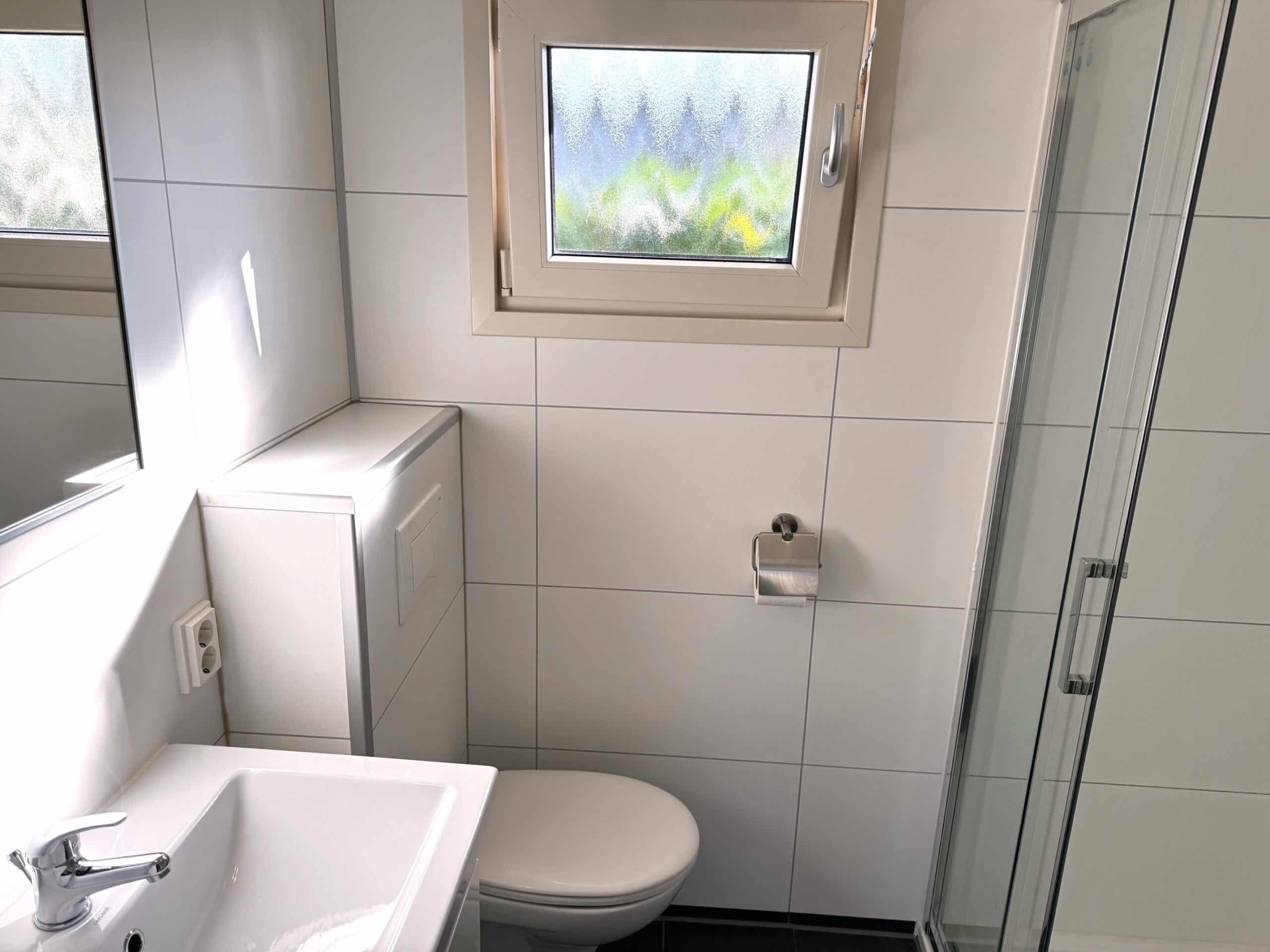 De badkamer is voorzien van 100% waterdichte Trespa wandpanelen die o0k nog schimmelwerend zijn, een ruime douchecabine, toilet, wastafel met meubel en spiegel, mechanische ventilatie en een draai/kiep-raamkozijn.