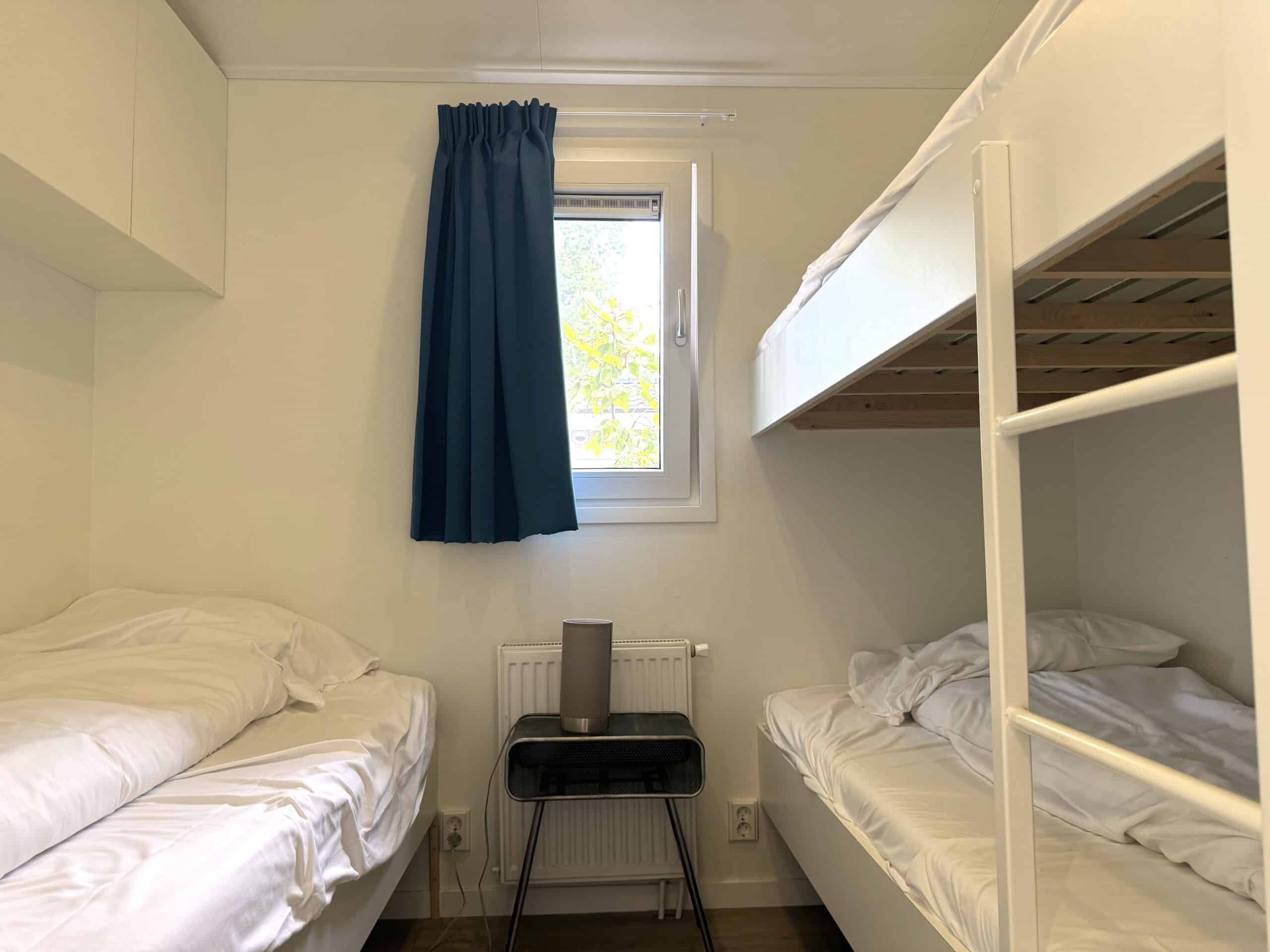 Er zijn 2 ruime slaapkamers waarvan 1 ruime slaapkamer met een tweepersoons boxspringbed, inbouwkast met schuifdeuren, draai-/kiepraamkozijn met ventilatieroosters, nachtkastjes. De tweede ruime slaapkamer heeft een tweepersoons stapelbed en een eenpersoons boxspringbed apart, zweefkasten naast het bed, draai-/kiepraamkozijn met ventilatieroosters en een nachtkastje.