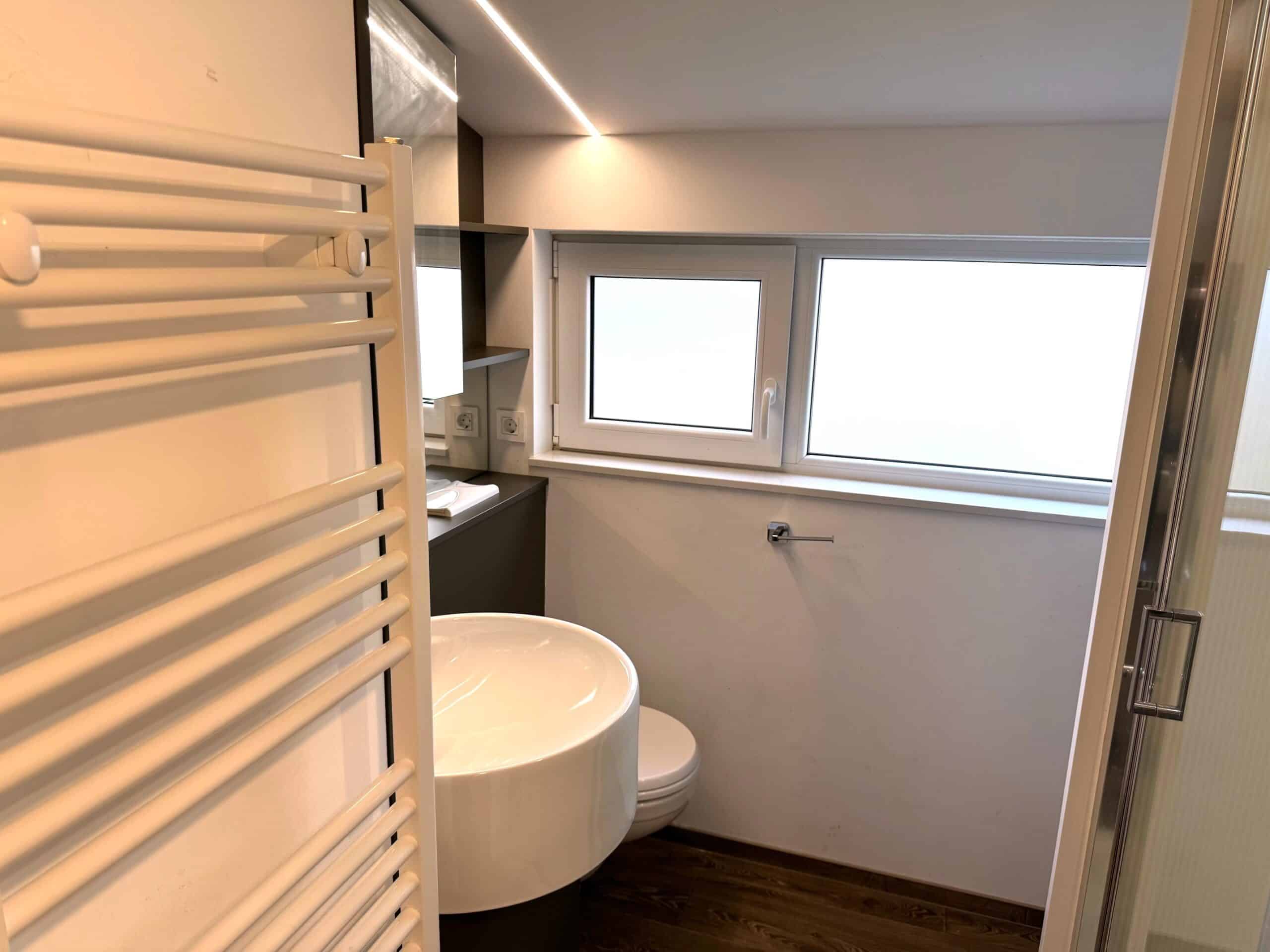 De moderne badkamer is voorzien van een toilet, wastafel met meubel en spiegel, ruime douchecabine, design radiator, kiep-kantel raamkozijn en een mechanische ventilatie.