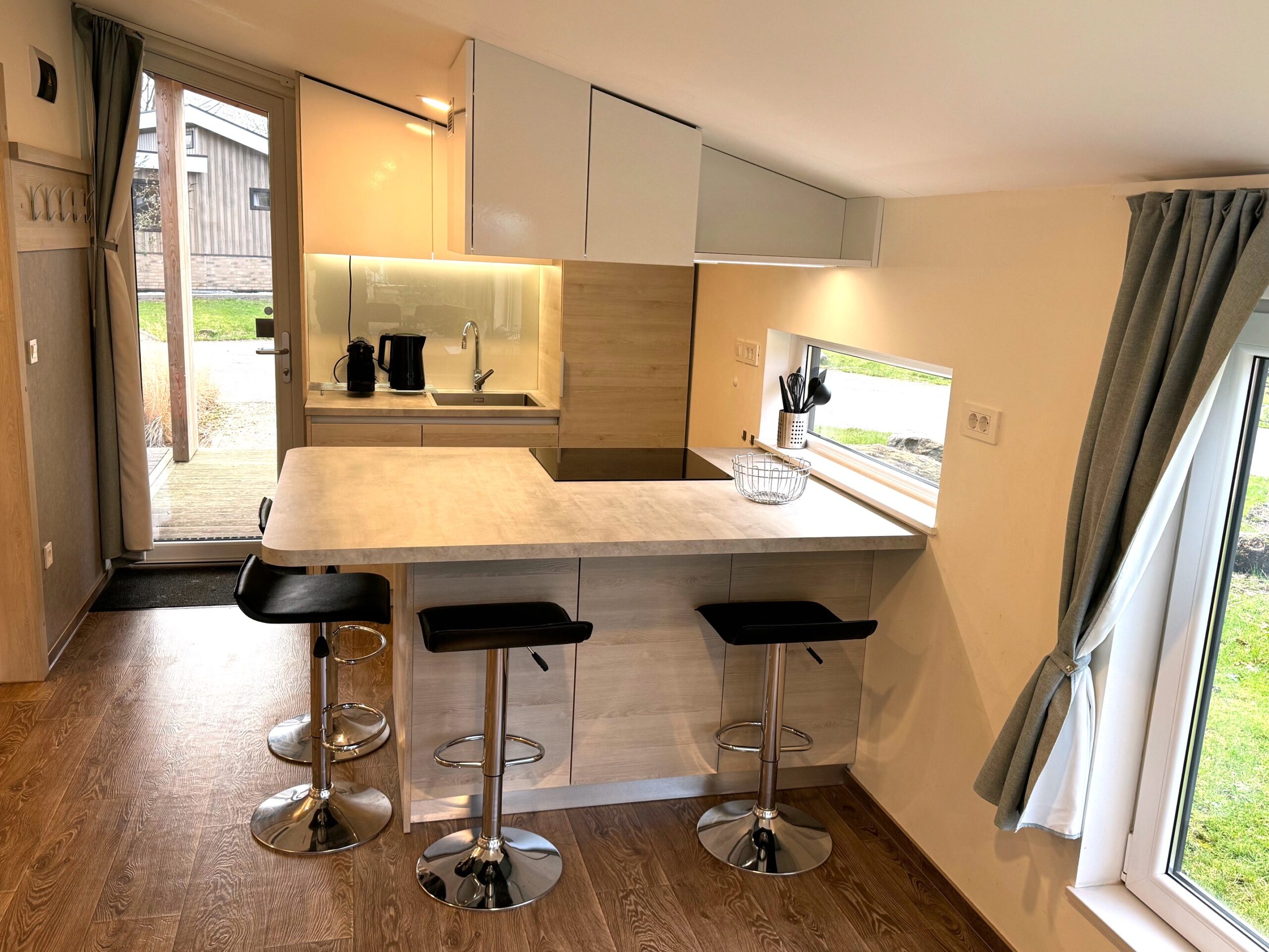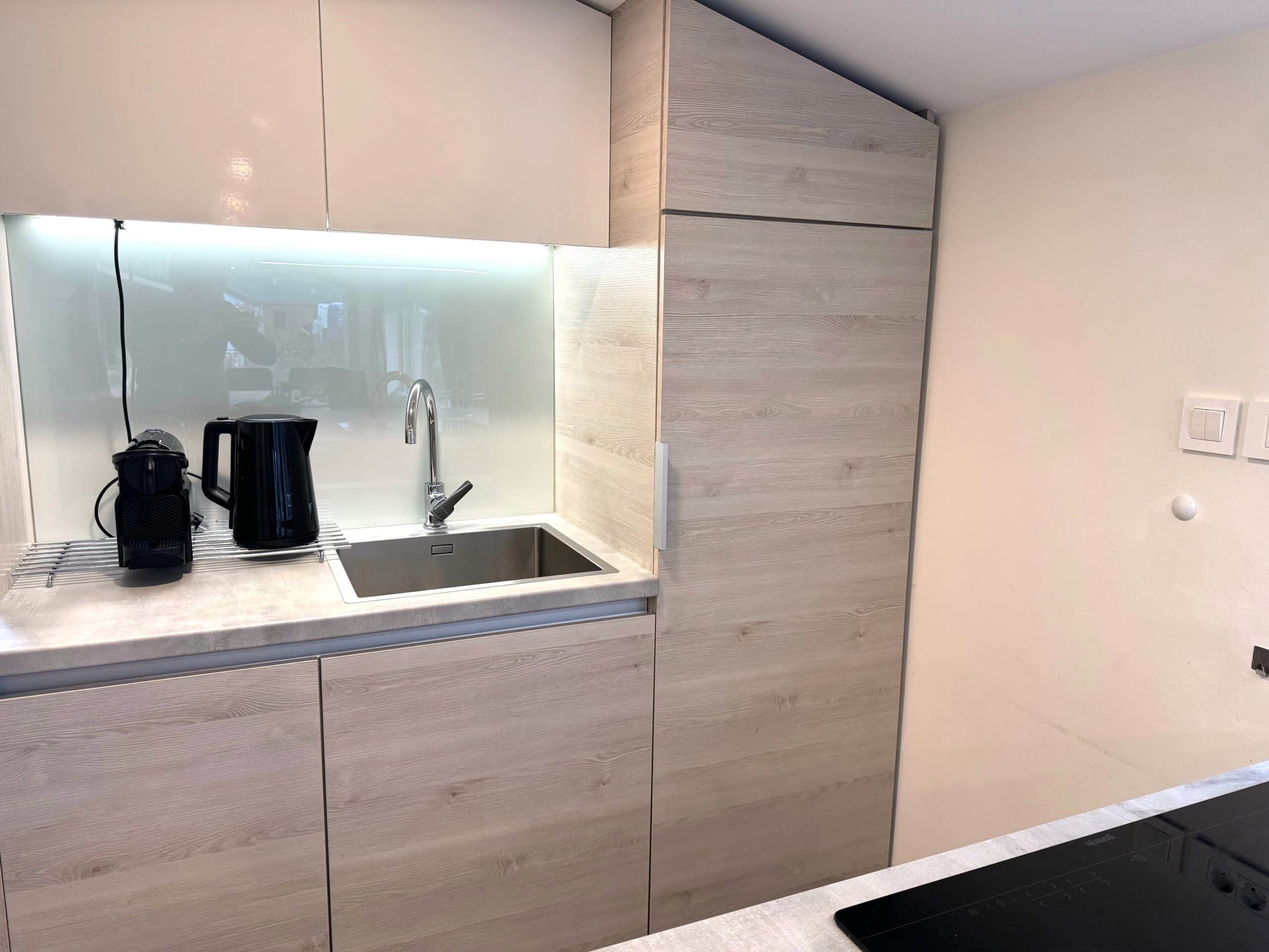 De moderne keuken is uitgevoerd in een lichte houtlook en van alle modern gemakken voorzien zoals een koelkast, vriezer, inductiekookplaat met ingebouwde afzuiger, combi-oven, vaatwasser, afwasbak met kraan, keukenraam en veel opberg ruimte.