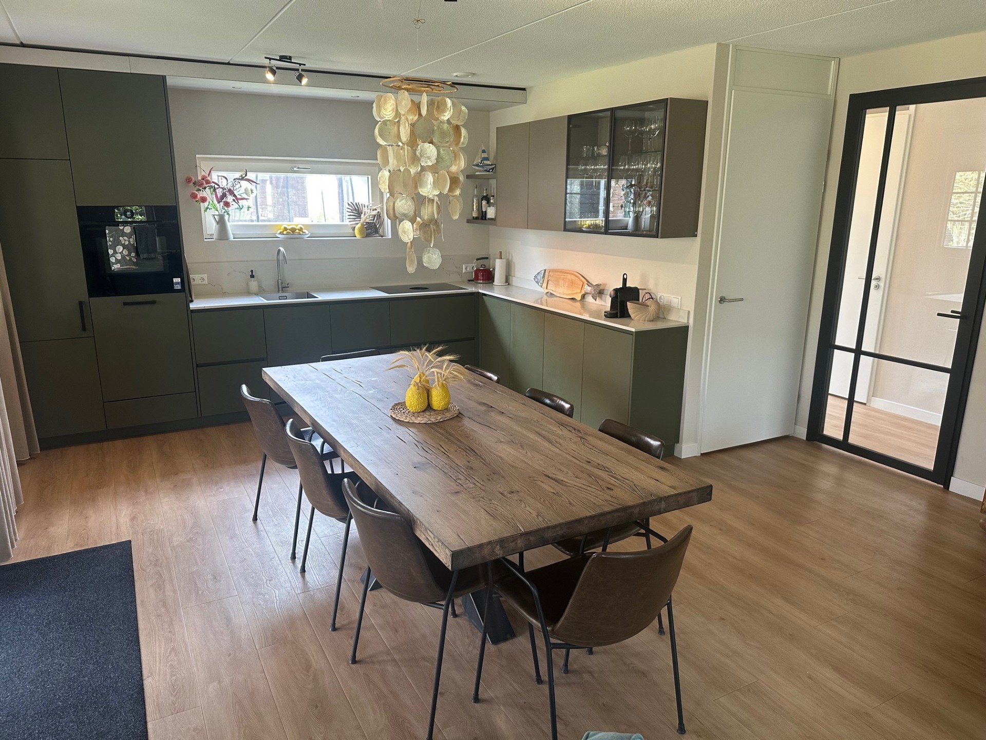 De luxe en moderne keuken is uitgevoerd in een mat groene-taupe kleur en is van alle moderne gemakken voorzien zoals een vaatwasser, inductiekookplaat met ingebouwde afzuigkap, combi magnetron, grote koelkast, vriezer met 2 lades, afwasbak met kraan en veel opberg/kast-ruimte. Naast de keuken is er nog een opslag/voorraadkast. De keuken vormt het culinaire middelpunt van het vakantiehuis. Ideaal voor een gezellige avond met vrienden en familie.
