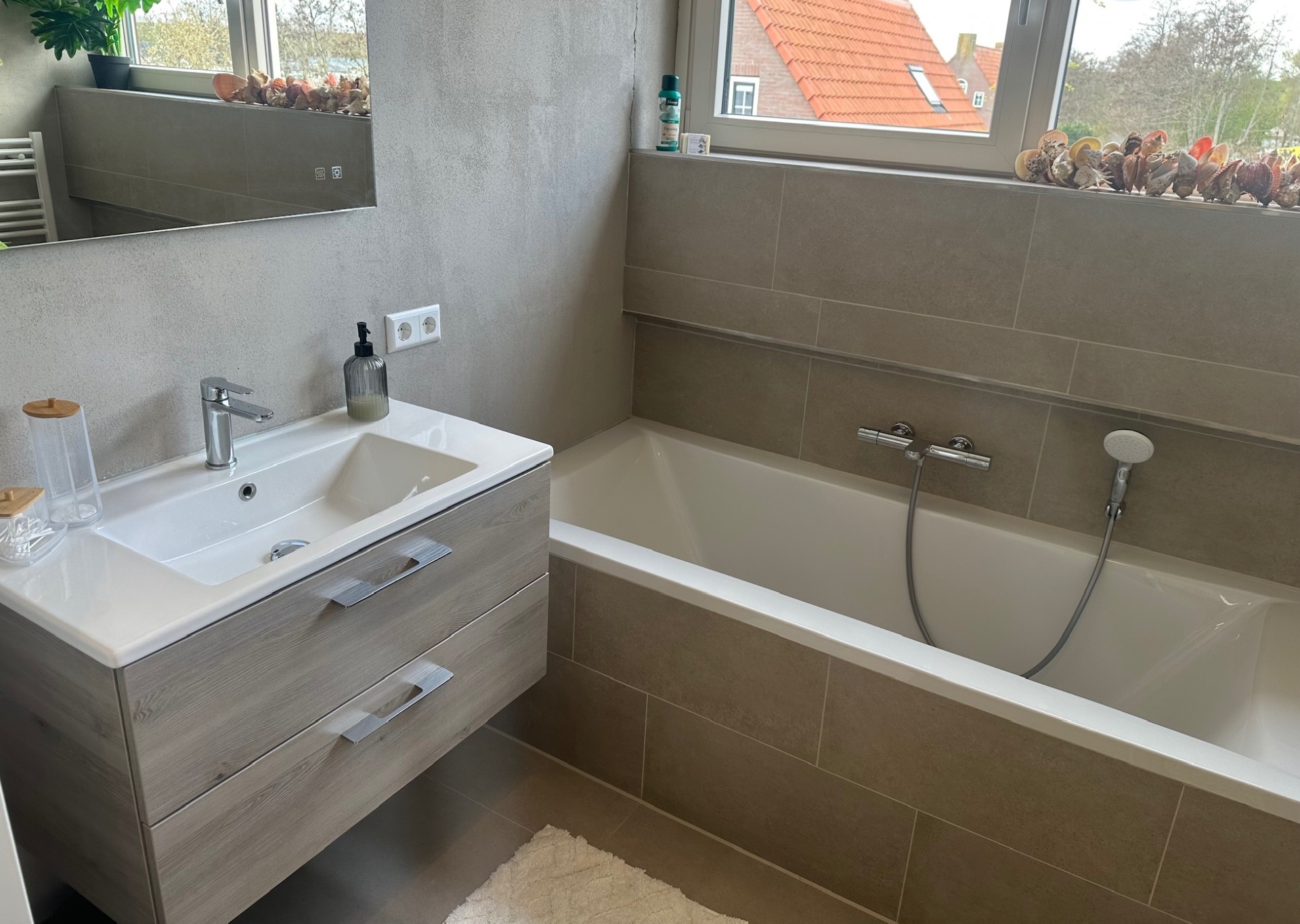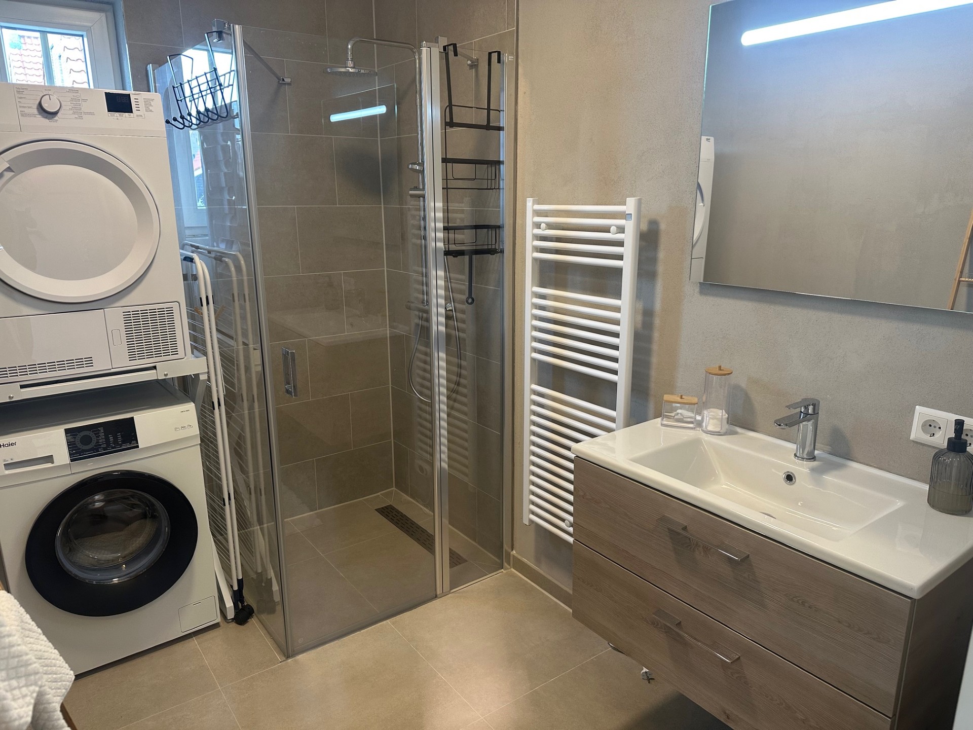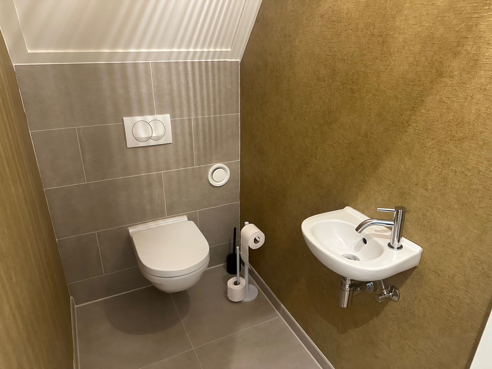Zowel op de begane grond als op de eerste etage is er een luxe badkamer en een aparte toilet ruimte. De badkamer op de begane grond is voorzien van een wastafel met meubel en spiegel, inloopdouche met regenkop, wasmachine en droger, kiepraam, design radiator en een handdoekenrek. De badkamer op de eerste etage is voorzien van een wastafel met meubel en spiegel, ligbad, inloopdouche, design radiator, kiep kozijnen. Naast beide badkamers is er een aparte toilet ruimte met een toilet en wasbak.