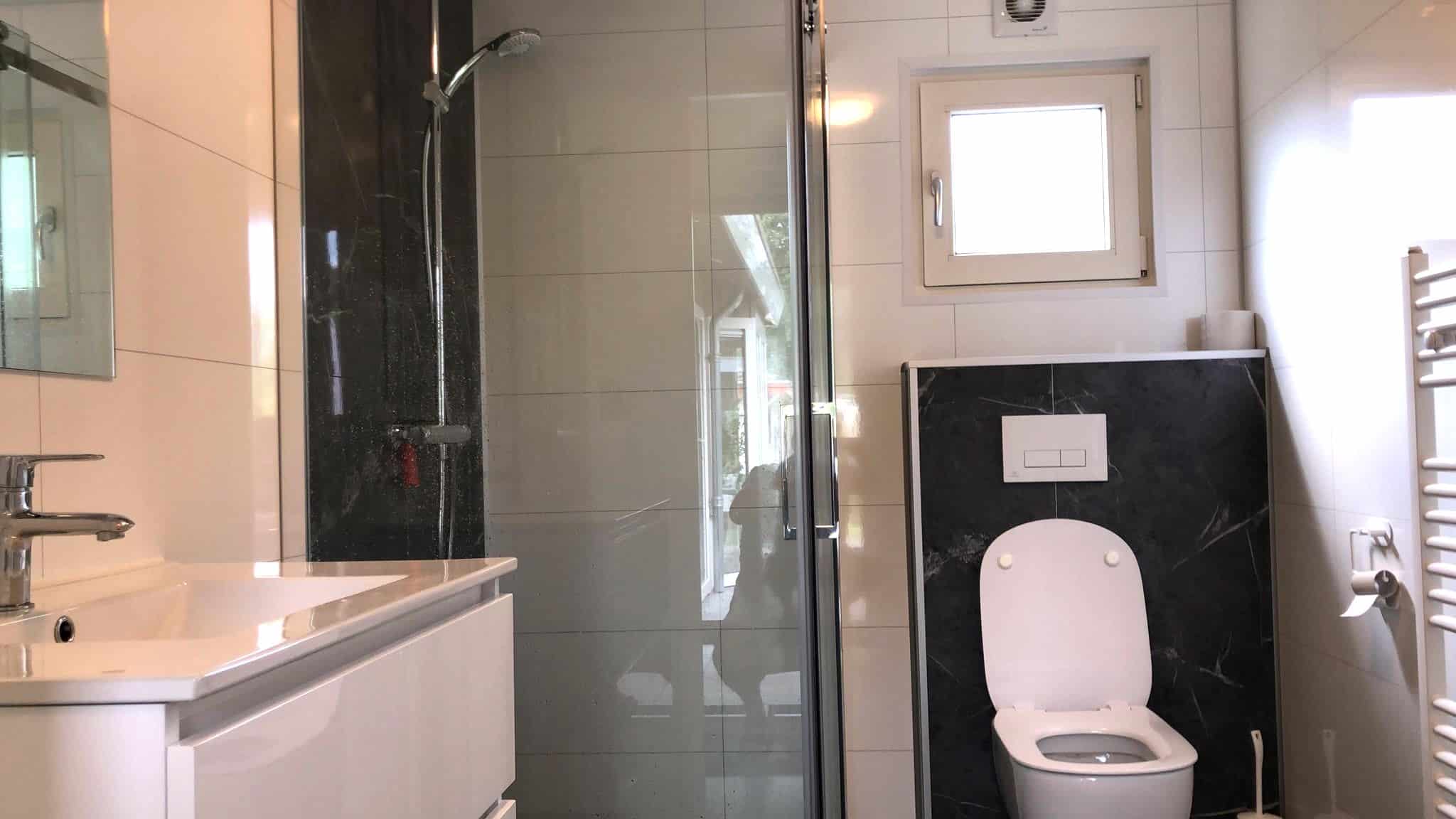 De badkamer is voorzien van 100% water dichte trespa wandplaten, de panelen zijn uiteraard eenvoudig te reinigen, maar ook antibacterieel en ongevoelig voor schimmels. Verder is de badkamer voorzien van een ruime douche, toilet, wastafel met meubel en spiegel, mechanische ventilatie, design radiator en een draai/kiep-raamkozijn. Ook heeft de badkamer een was/droogmachine aansluiting.