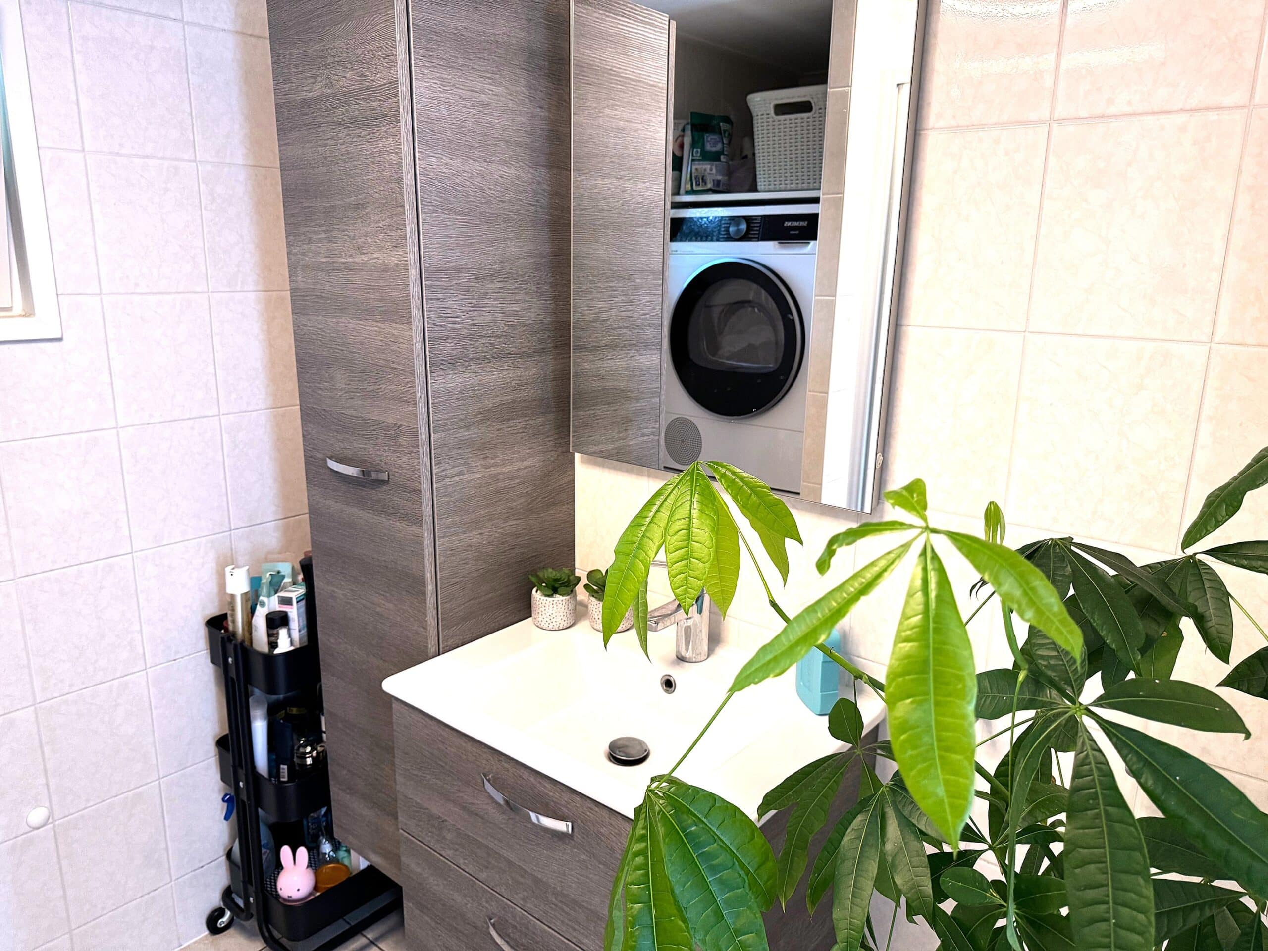 De moderne badkamer is voorzien van een wastafel met meubel en spiegel, een ruime douchecabine en een draai-/kiepraam. Daarnaast is er een aparte ruimte ingericht voor een wasmachine en droger.