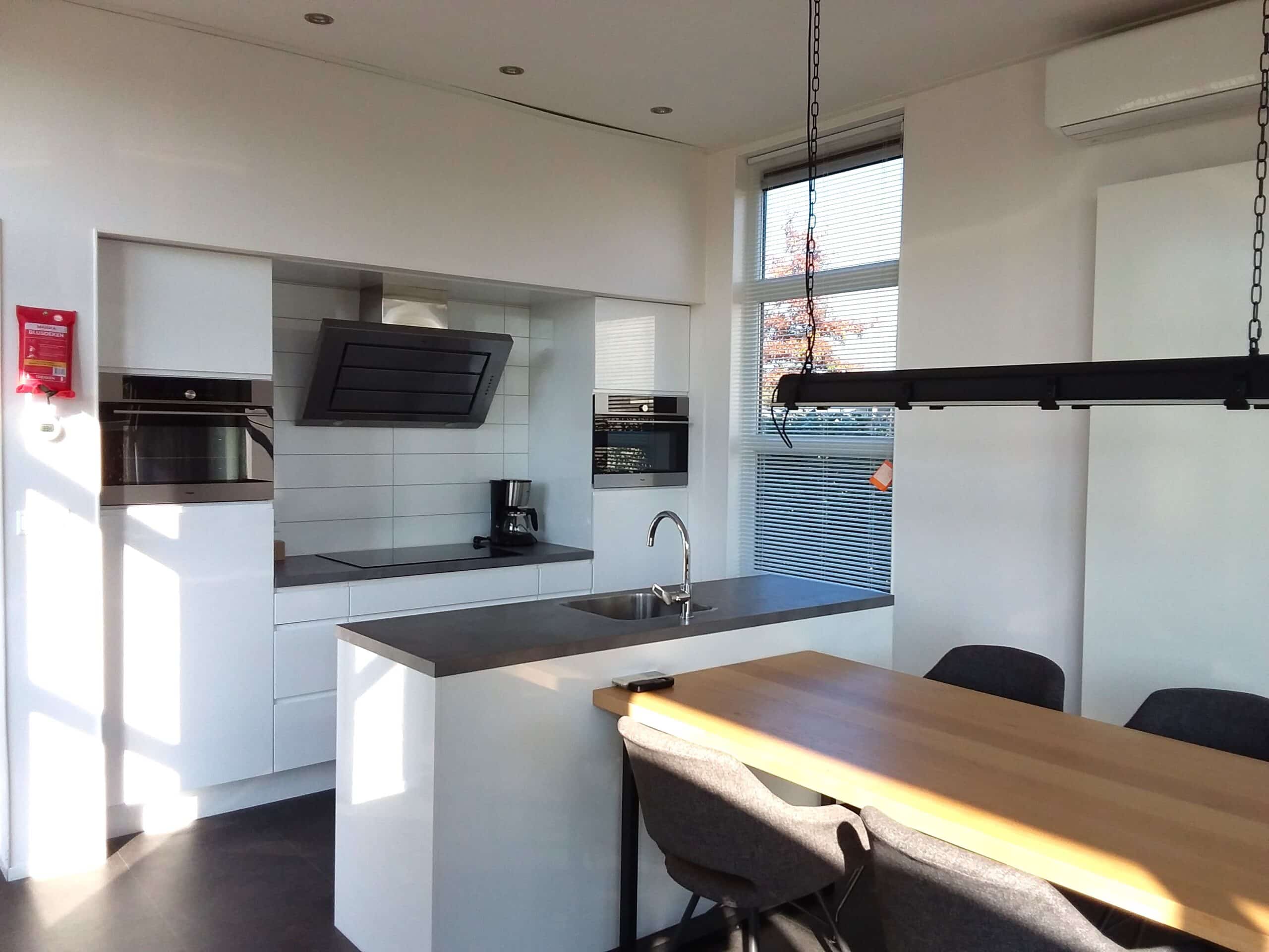 De luxe en moderne keuken met eiland is uitgevoerd in hoogglans wit en is van alle moderne gemakken voorzien zoals een vaatwasser, 4 pits gasfornuis, afzuigkap, magnetron, oven, koelkast, vriezer, afwasbak met kraan, waterkoker, koffiezetapparaat en veel opberg/kast-ruimte. De keuken vormt het culinaire middelpunt van het vakantiehuis.