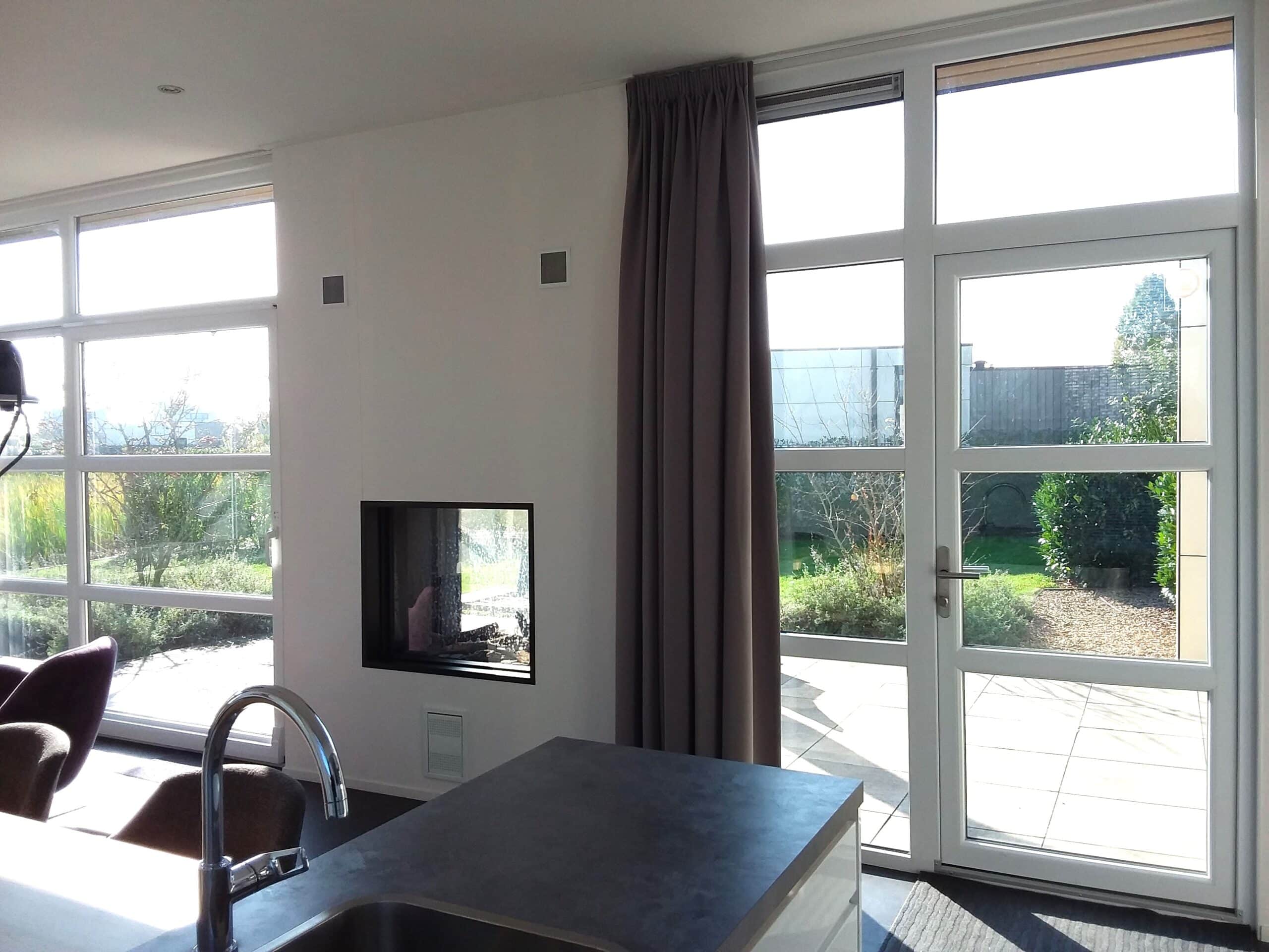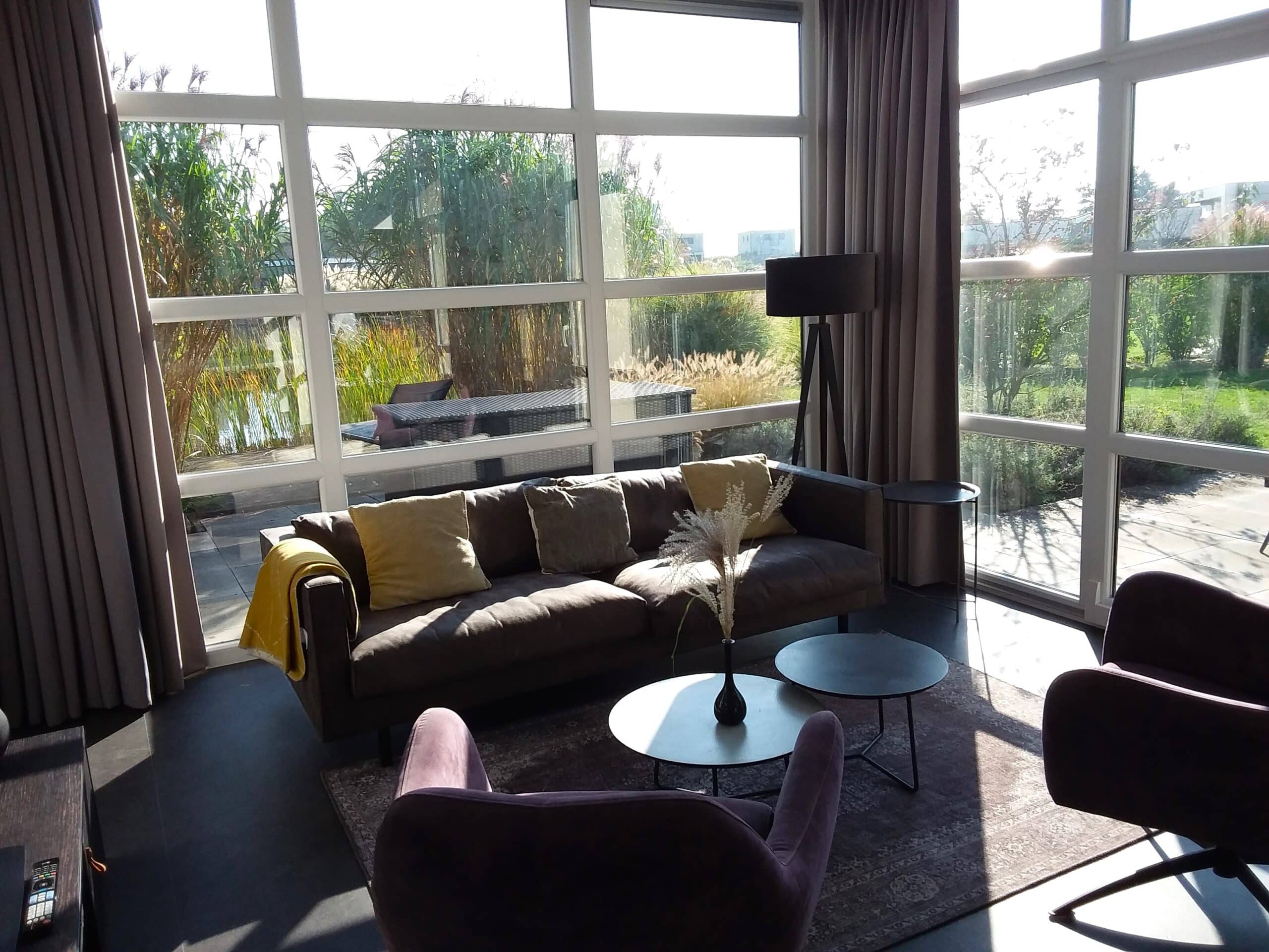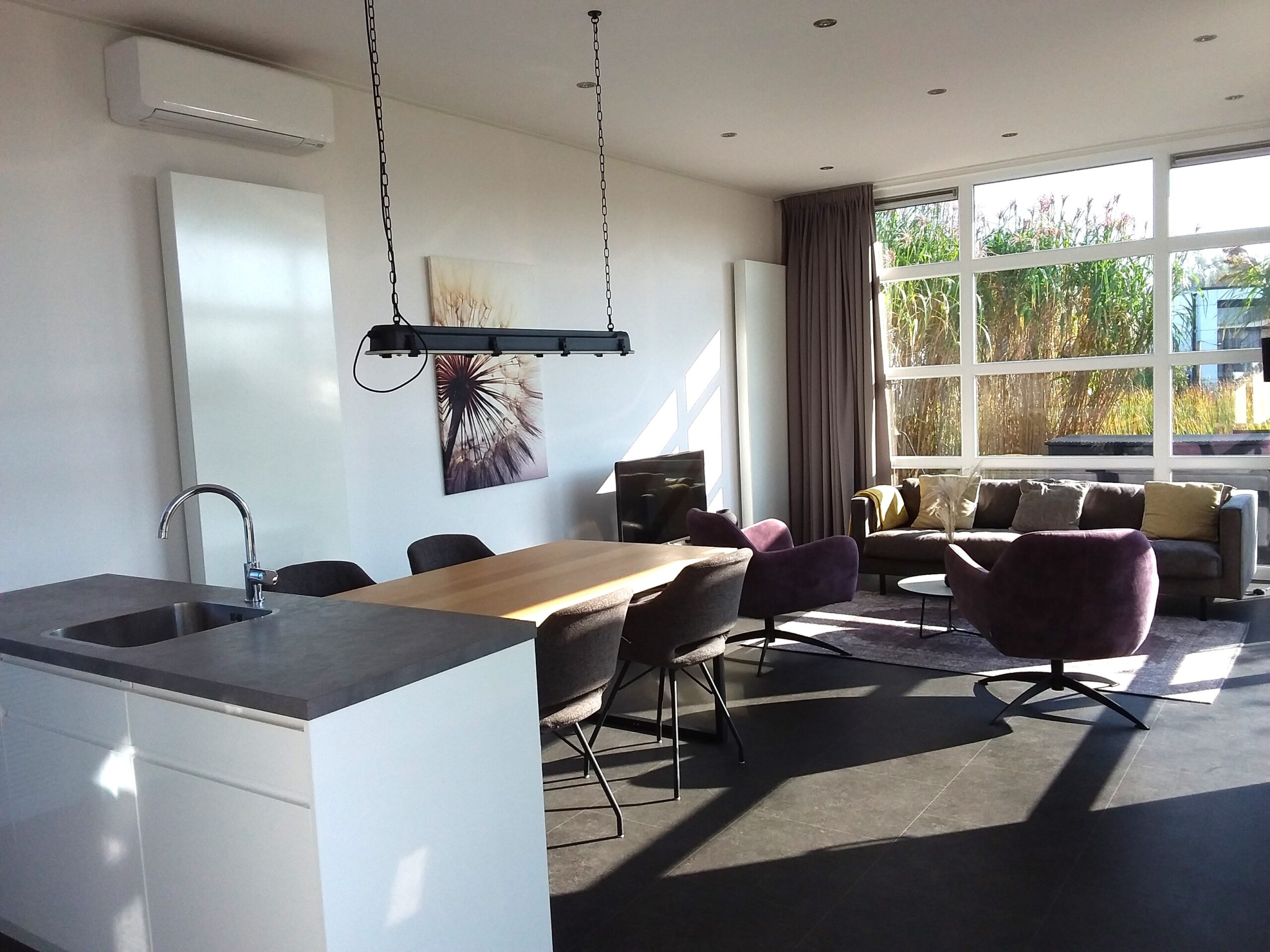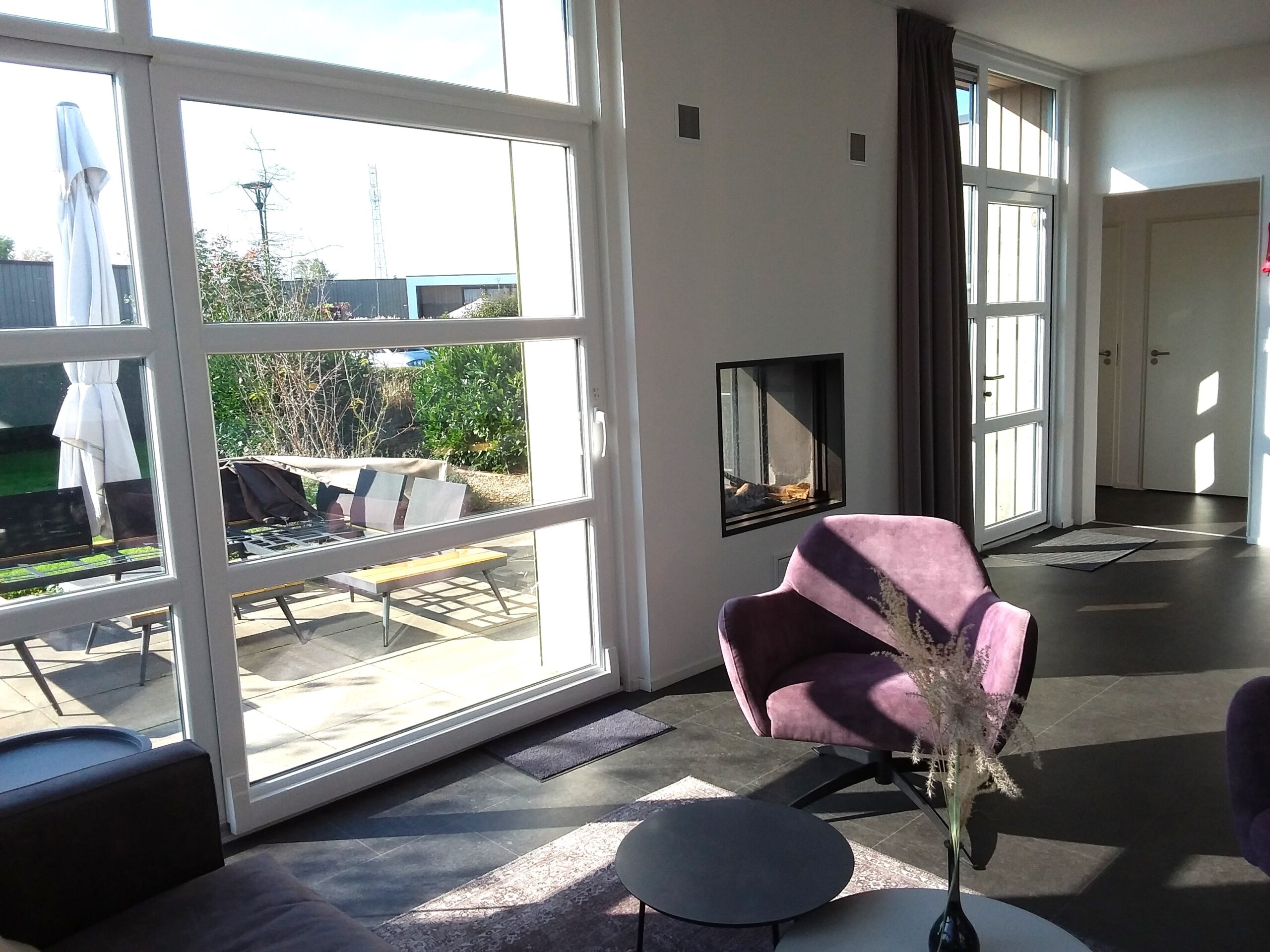 Het vakantiehuis beschikt over een royale woonkamer met een open eet en woon gedeelte. De combinatie van de grote raampartijen en het extra verhoogd plafond, geven u een extra ruimtelijk gevoel en natuurlijk een mooi uitzicht over de tuin en vijver. In de woonkamer is er een gas haard ingebouwd waardoor je een warme en gezellige sfeer creëert. Verder is de woonkamer voorzien van een airco waarmee u kunt koelen maar ook mee kunt verwarmen. Doormiddel van een schuifpui loopt u zo vanuit de woonkamer uw Betegeld terras op waar u heerlijk kunt genieten van een ruime tuin en uw eigen plekje onder de zon.