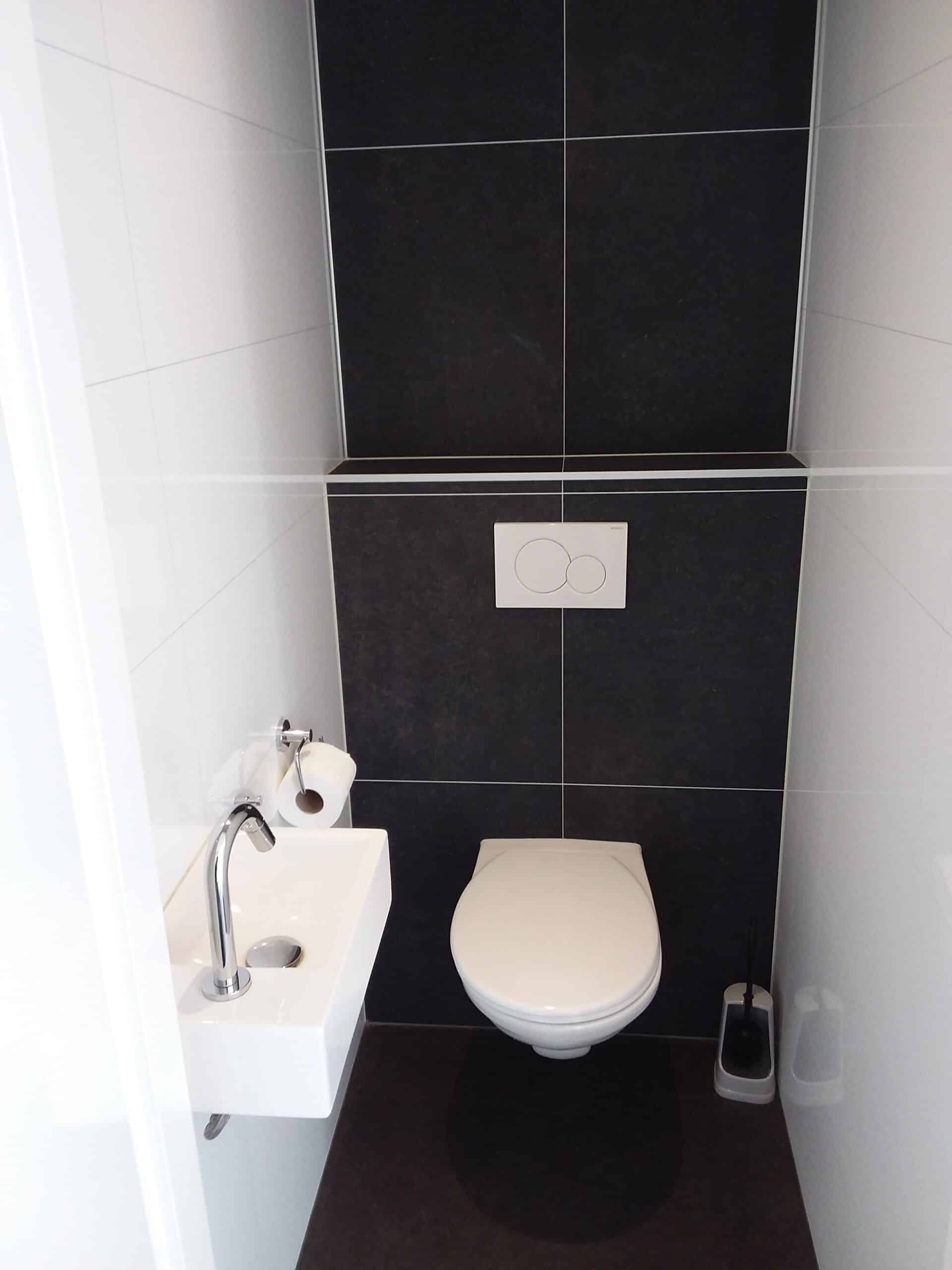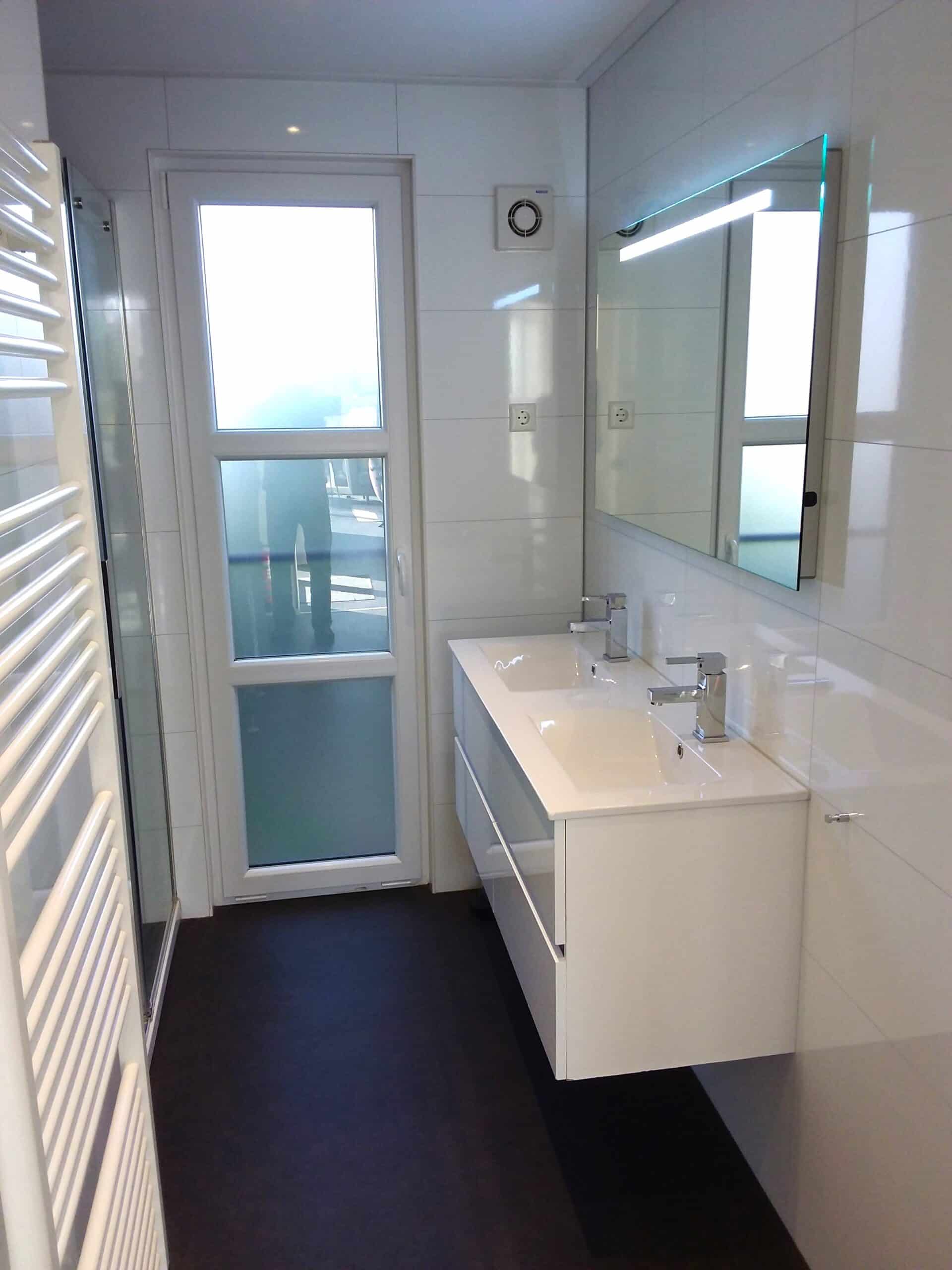De royale badkamer is voorzien van 100% waterdichte Trespa wandpanelen die o0k nog schimmelwerend zijn, een ruime inloop douche, dubbele wastafel met meubel en spiegel, mechanische ventilatie, design radiator en een draai/kiep-raamkozijn. Naast de badkamer is er een aparte toilet ruimte.