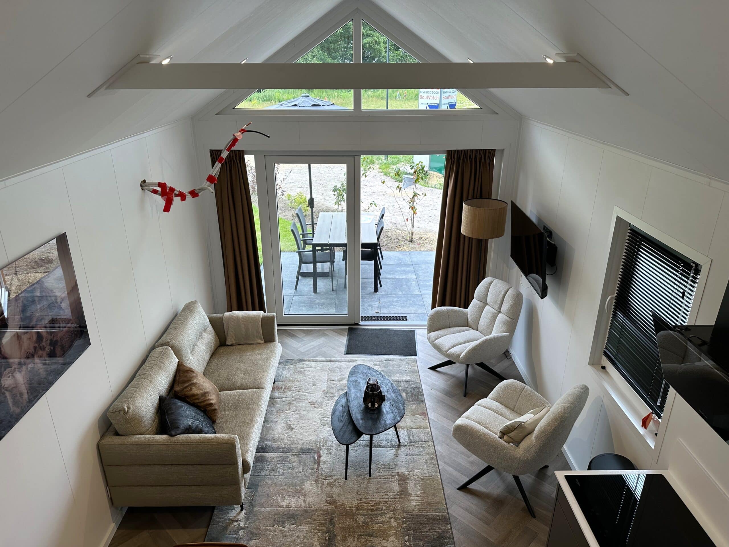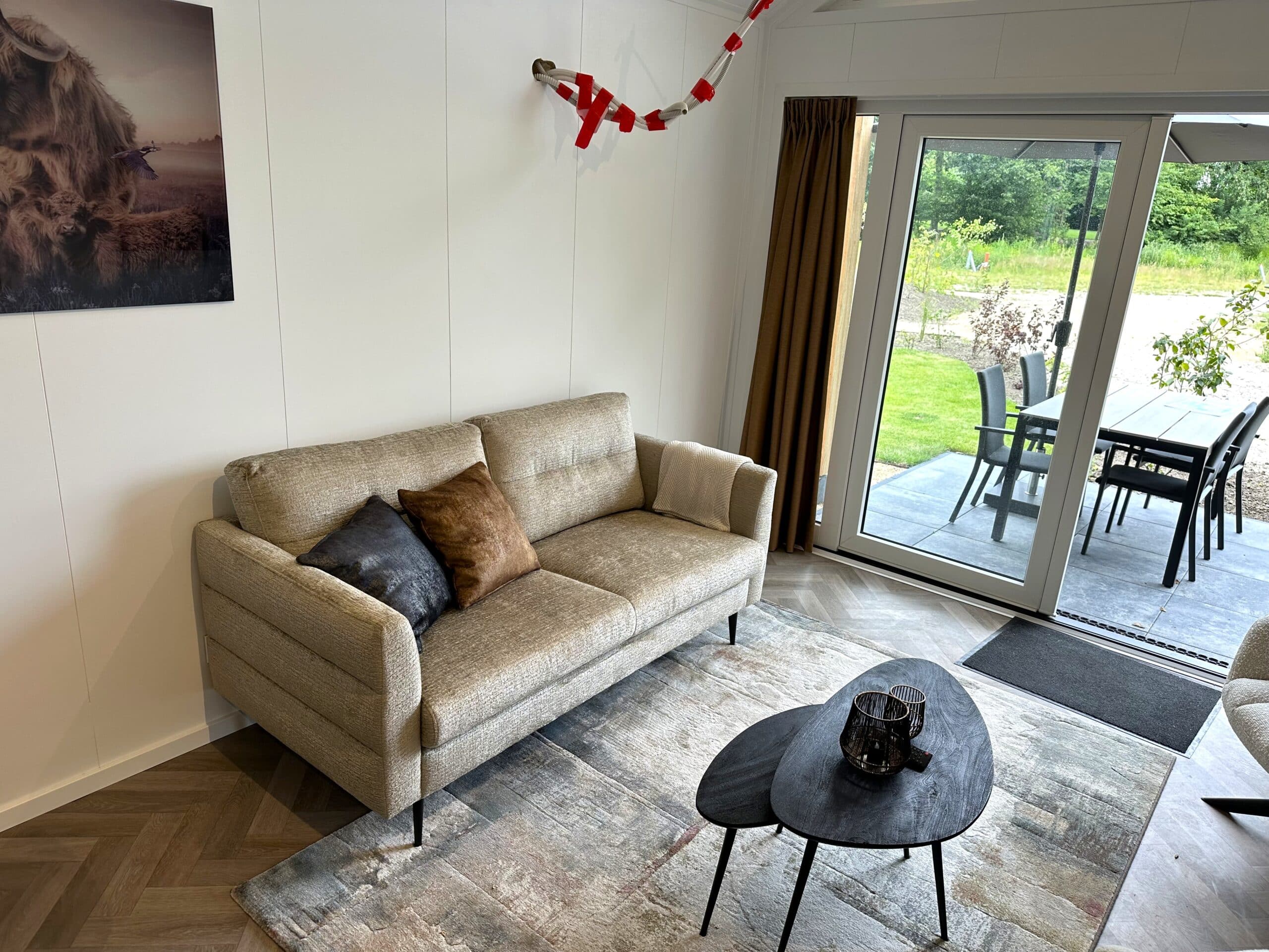 De royale woonkamer van de Tiny Bos Lodge voelt extra ruim dankzij het verhoogde plafond en grote raampartijen die veel licht binnenlaten en uitzicht bieden op de groene tuin. De open indeling van het woon- en eetgedeelte zorgt voor een gezellige, luchtige sfeer. De warmtepomp biedt comfort in alle seizoenen: koelen in de zomer, verwarmen in de winter. Via de openslaande deuren loopt u zo het overdekte terras op – uw eigen plek om te ontspannen in rust en natuur. Licht, ruimte en luxe in één!