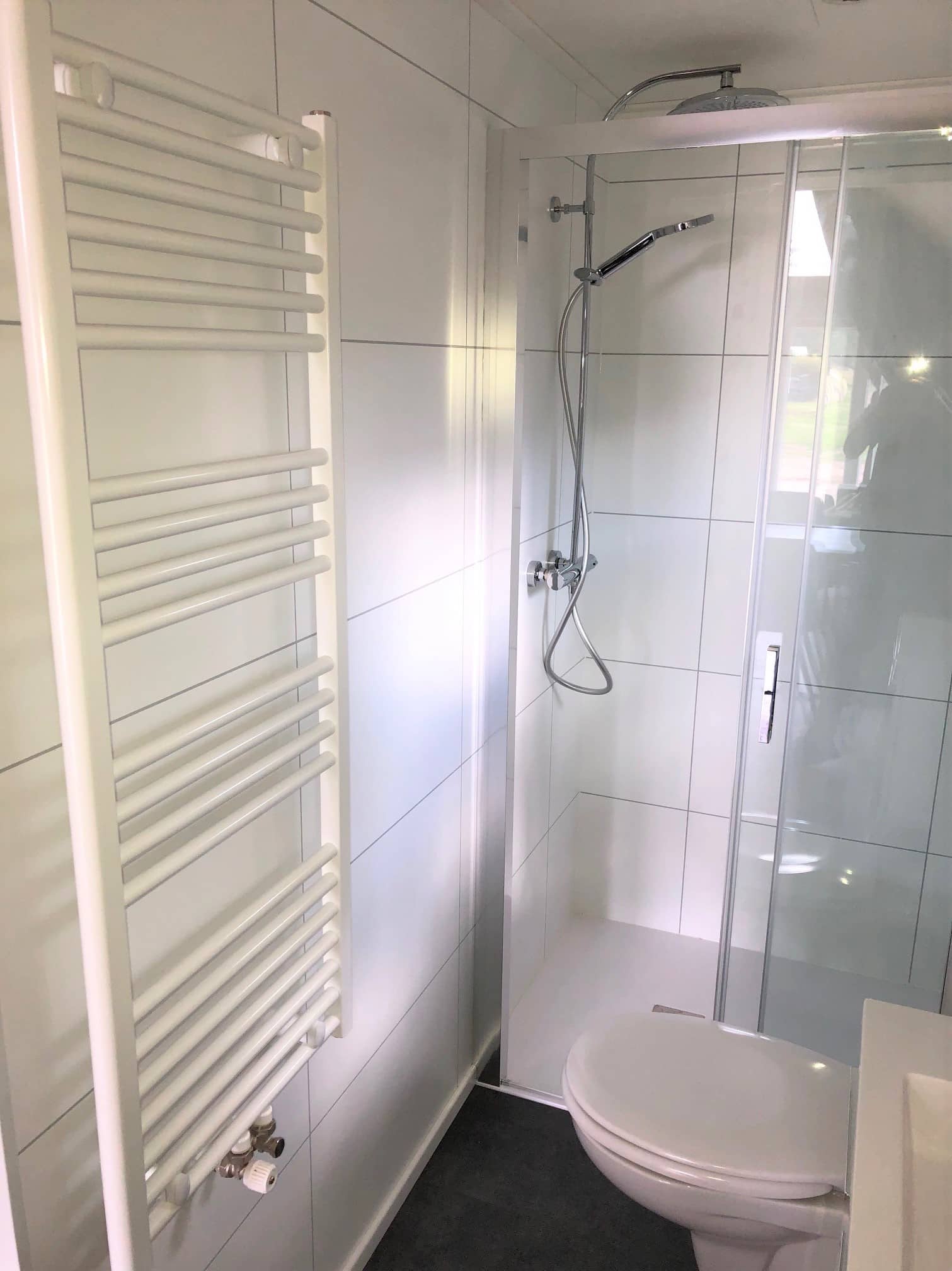 De riante en moderne badkamer is voorzien van 100% waterdichte trespo wandpanelen in tegellook, een inloopdouche, wastafel met meubel en een spiegelkast, design radiator, mechanische ventilatie en een kiepkozijn.