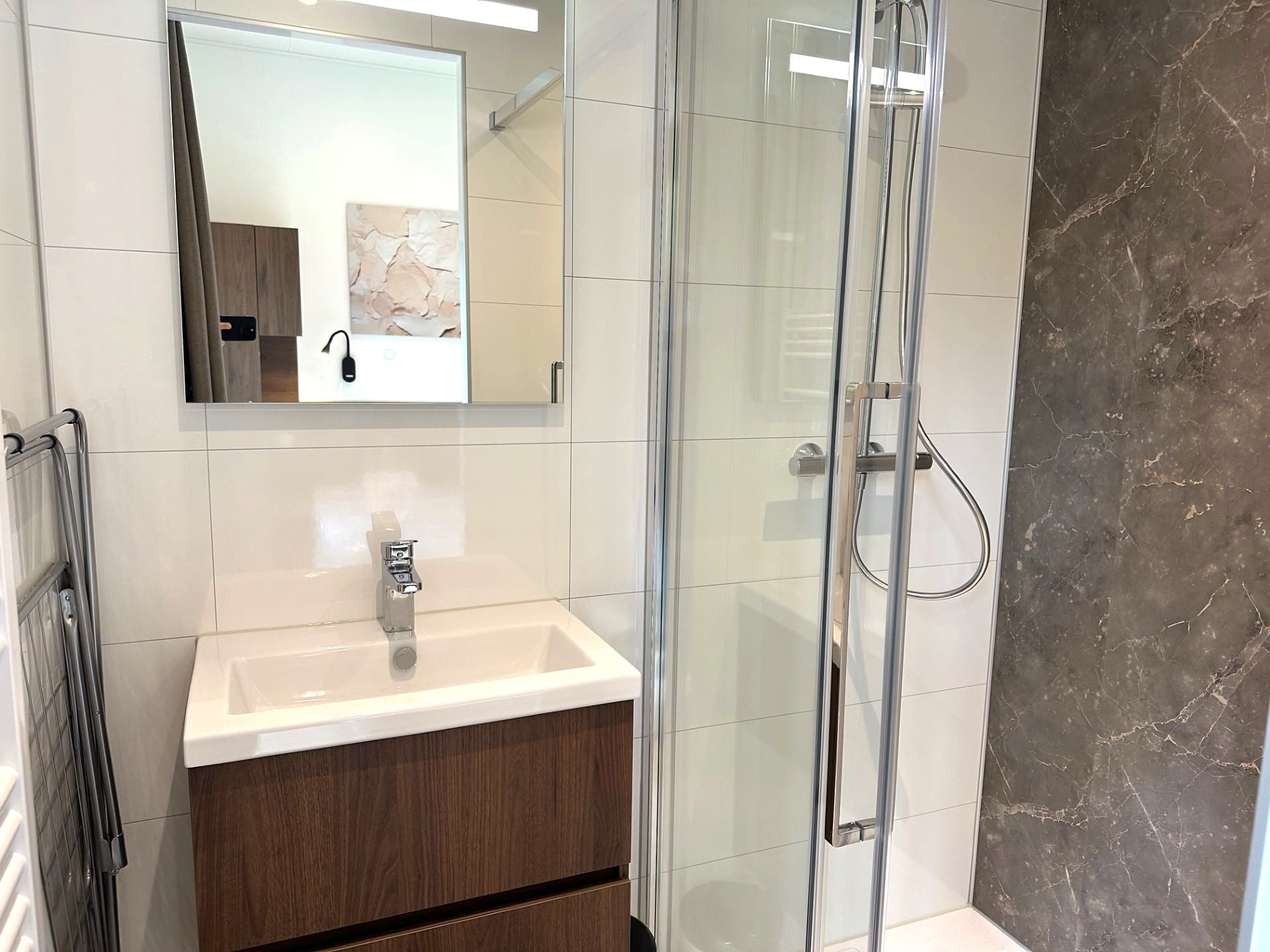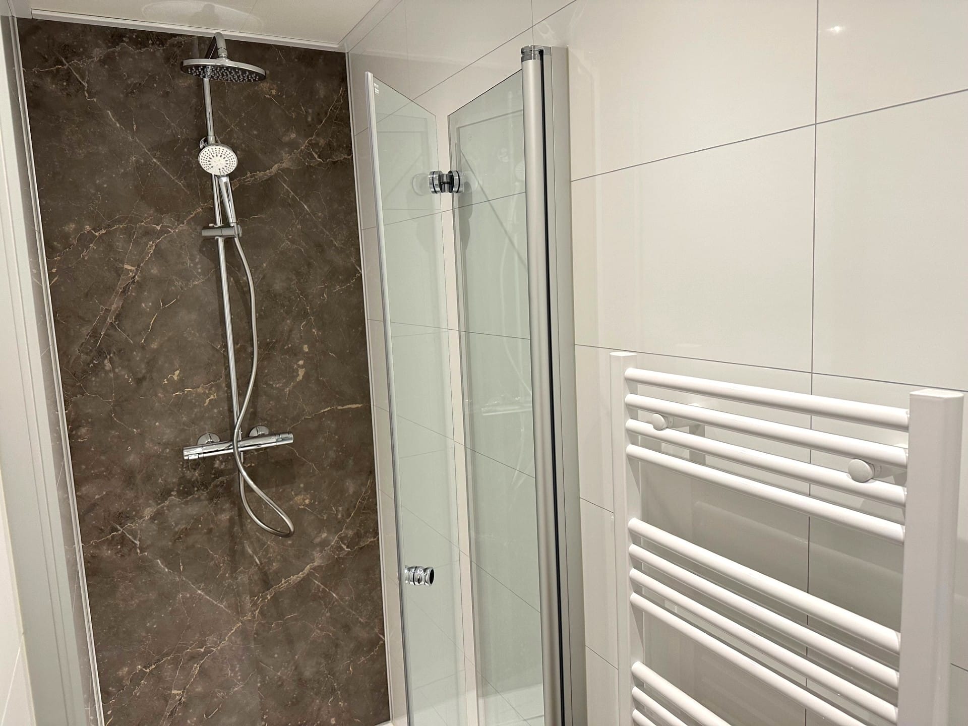 De riante en modern afgewerkte badkamer van de Villa Bosrijk is voorzien van stijlvolle, 100% waterdichte Trespa wandpanelen. U geniet hier van het comfort van een ruime inloopdouche, toilet, een wastafel met meubel en een praktische spiegelkast. De designradiator zorgt voor aangename warmte, terwijl de mechanische ventilatie en het draai-/kiepraam zorgen voor een fris en gezond binnenklimaat. Een comfortabele en onderhoudsvriendelijke ruimte om elke dag ontspannen te beginnen.