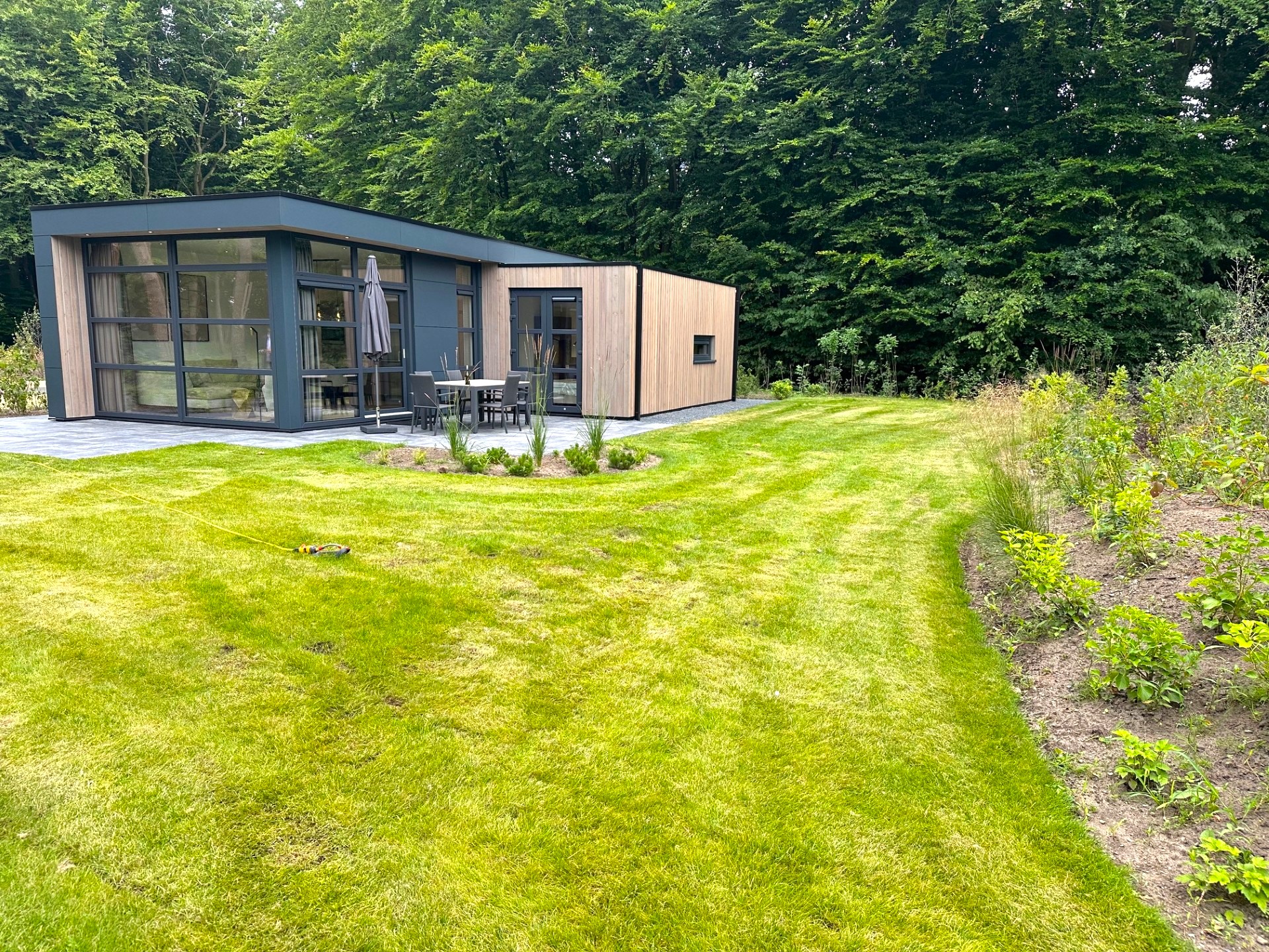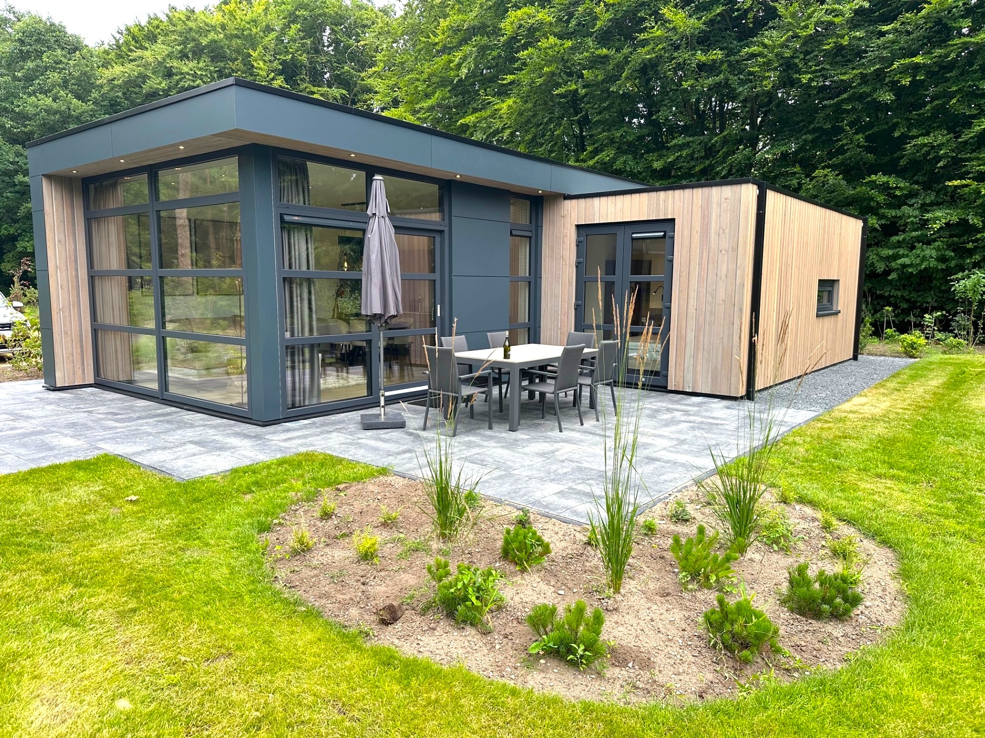 De royale woonkamer van de Villa Bosrijk Z voelt extra ruim dankzij het verhoogde plafond en grote raampartijen die veel licht binnenlaten en uitzicht bieden op de groene tuin. De open indeling van het woon- en eetgedeelte zorgt voor een gezellige, luchtige sfeer. De warmtepomp biedt comfort in alle seizoenen: koelen in de zomer, verwarmen in de winter. Een sfeervolle haard voegt warmte en gezelligheid toe aan de ruimte. Via de schuifpui stap je direct het betegelde terras op, waar je kunt genieten van de ruime tuin en je eigen zonovergoten plekje. Perfect voor ontspannen momenten in de natuur.